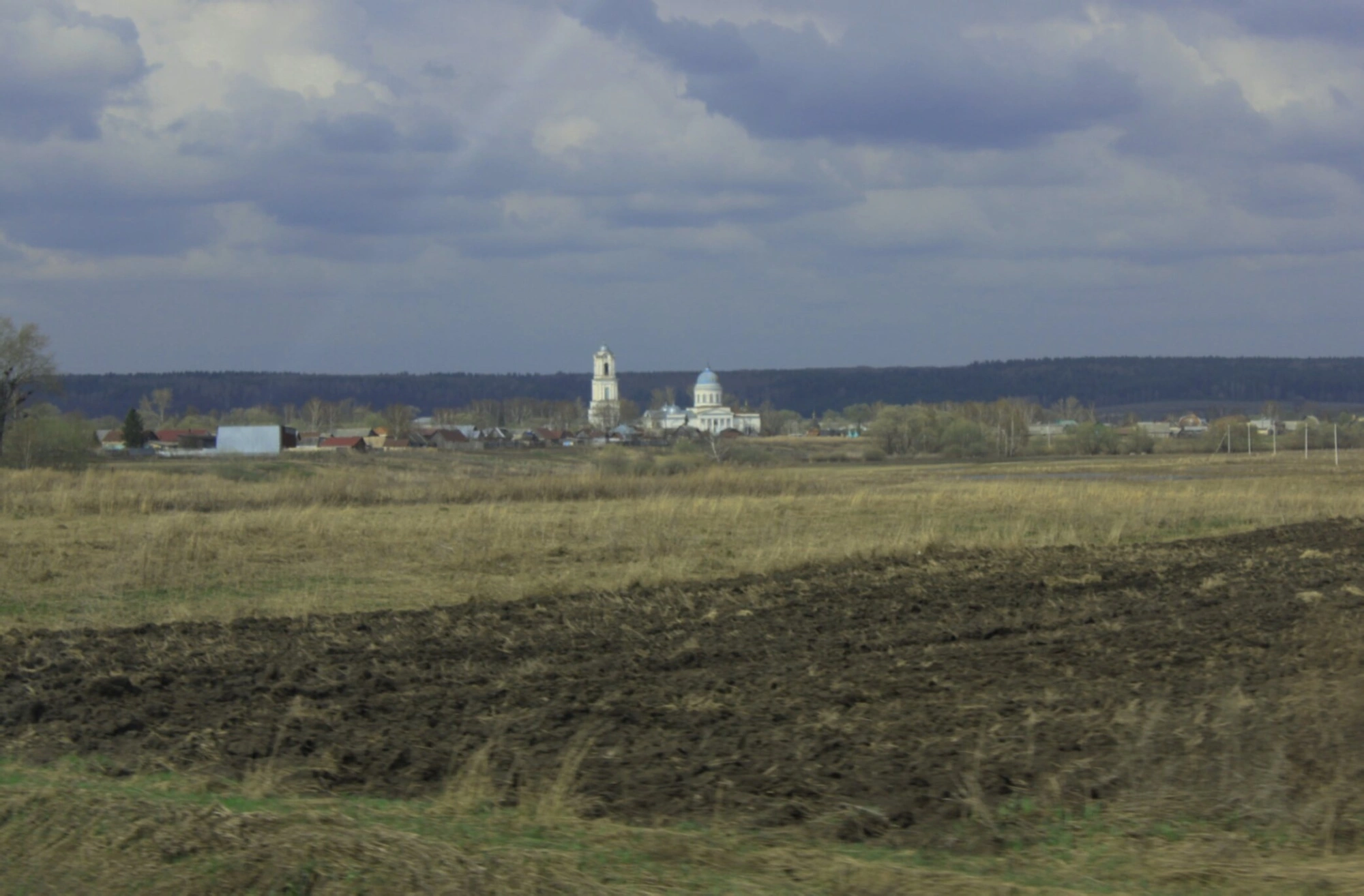 На заднем плане фотографии виден густой лес, обрамляющий сельский пейзаж и создающий особое настроение умиротворения и гармонии между творением рук человеческих и природной красотой. Церковь, окружённая просторами полей и лесами, представляет собой характерный для русской глубинки вид, где духовный центр жизни традиционно находится в единении с окружающим миром.