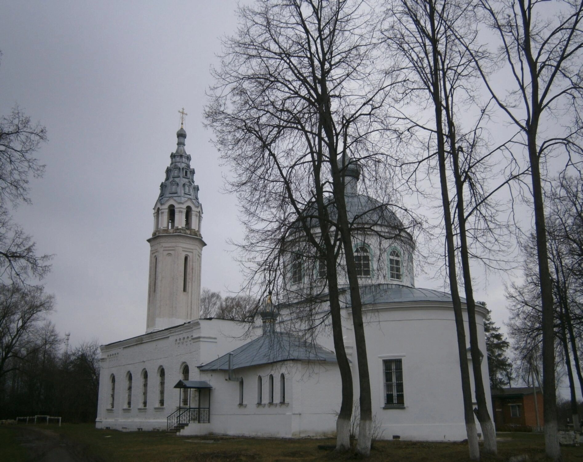 Храм располагается в живописной местности на территории исторического кладбища. На снимке видно, что церковь стоит на открытом пространстве, окружённая деревьями, что создаёт ощущение уединённости и покоя. Пасмурная погода, запечатлённая на фотографии, придаёт образу особую лиричность и созерцательное настроение, напоминая о вечности и бренности земного бытия.