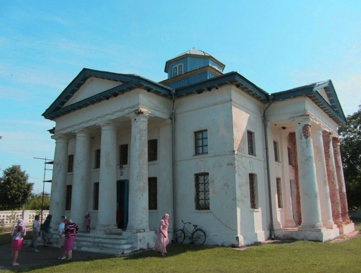 На представленной фотографии запечатлён Свято-Екатерининский храм, расположенный в деревне Гадичево Ветковского района Гомельской области. Этот православный храм, освящённый в честь святой великомученицы Екатерины, является ярким образцом архитектуры классицизма, получившим распространение на белорусских землях в конце XVIII — первой половине XIX века.