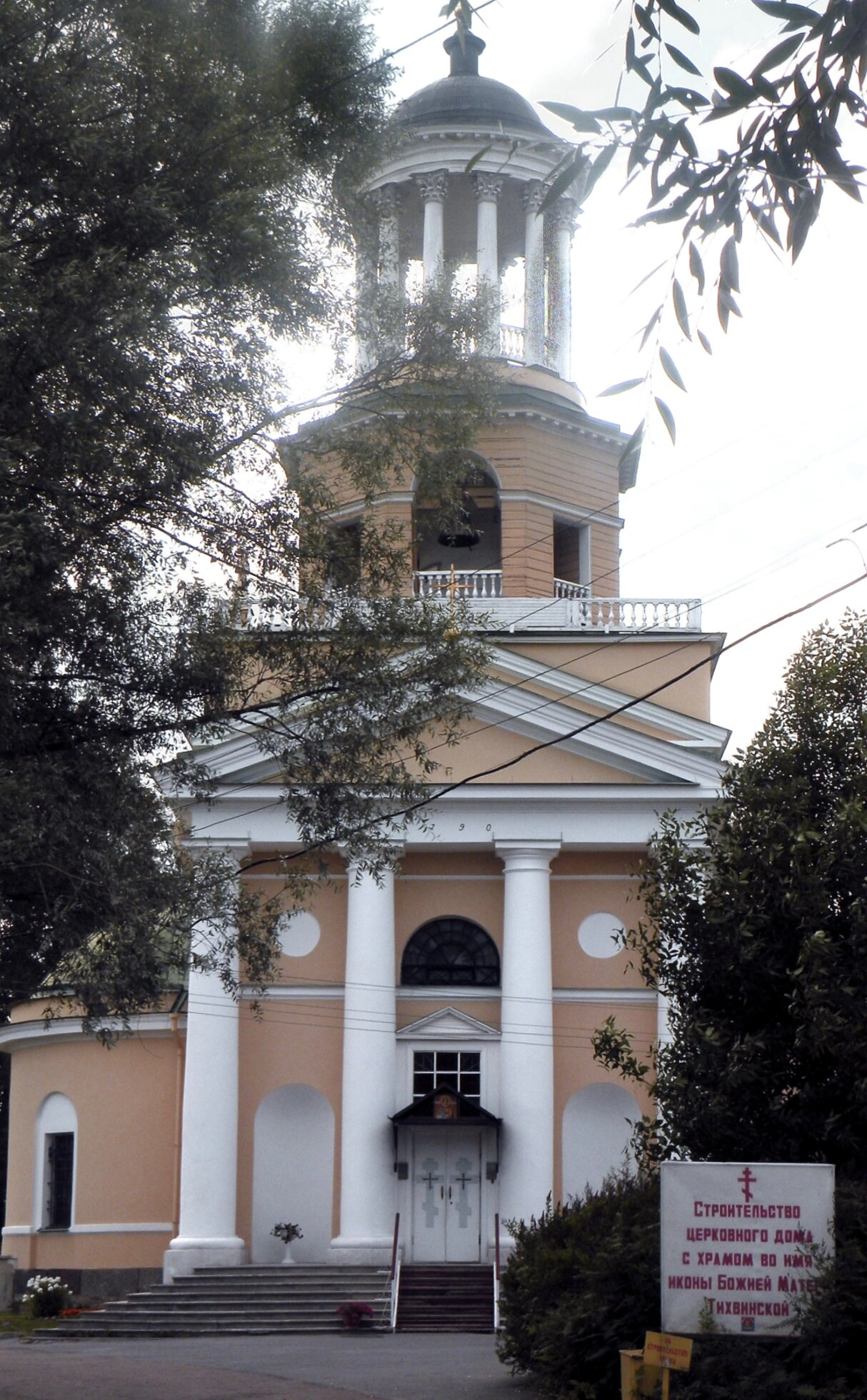 Храм окружён зеленью деревьев, что создаёт ощущение уединённости и покоя, свойственное святым местам. На переднем плане фотографии видна информационная табличка, сообщающая о строительстве церковного дома с храмом во имя иконы Божией Матери Тихвинской, что свидетельствует о развитии церковной жизни на этом месте.