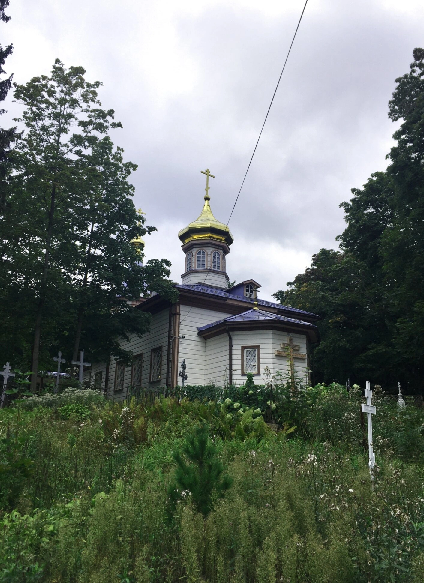 На представленной фотографии запечатлён величественный образ храма Святой Великомученицы Екатерины, расположенного в городе Петрозаводске. Святыня, увенчанная золочёным куполом с воздвигнутым на нём крестом, сияет под небом Карелии, являя собой пример духовного steadfastния и архитектурной гармонии. Храм окружён спокойствием прихрамовой территории, где среди ухоженной зелени и деревьев виднеются намогильные кресты, свидетельствующие о наличии церковного кладбища.