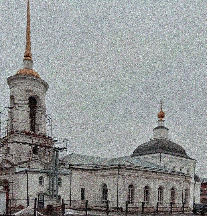 В момент съёмки на колокольне были установлены строительные леса, что свидетельствует о проведении благочестивых трудов по реставрации и сохранению святыни для будущих поколений. Это зримое напоминание о непрестанной заботе, которую требует дом Божий. Архитектурный облик храма включает в себя высокую ярусную колокольню, увенчанную крестом, и основной объём с мощным куполом, также завершающимся крестом — символом нашего спасения. Чётко видны арочные оконные проёмы, придающие строению лёгкость и изящество.