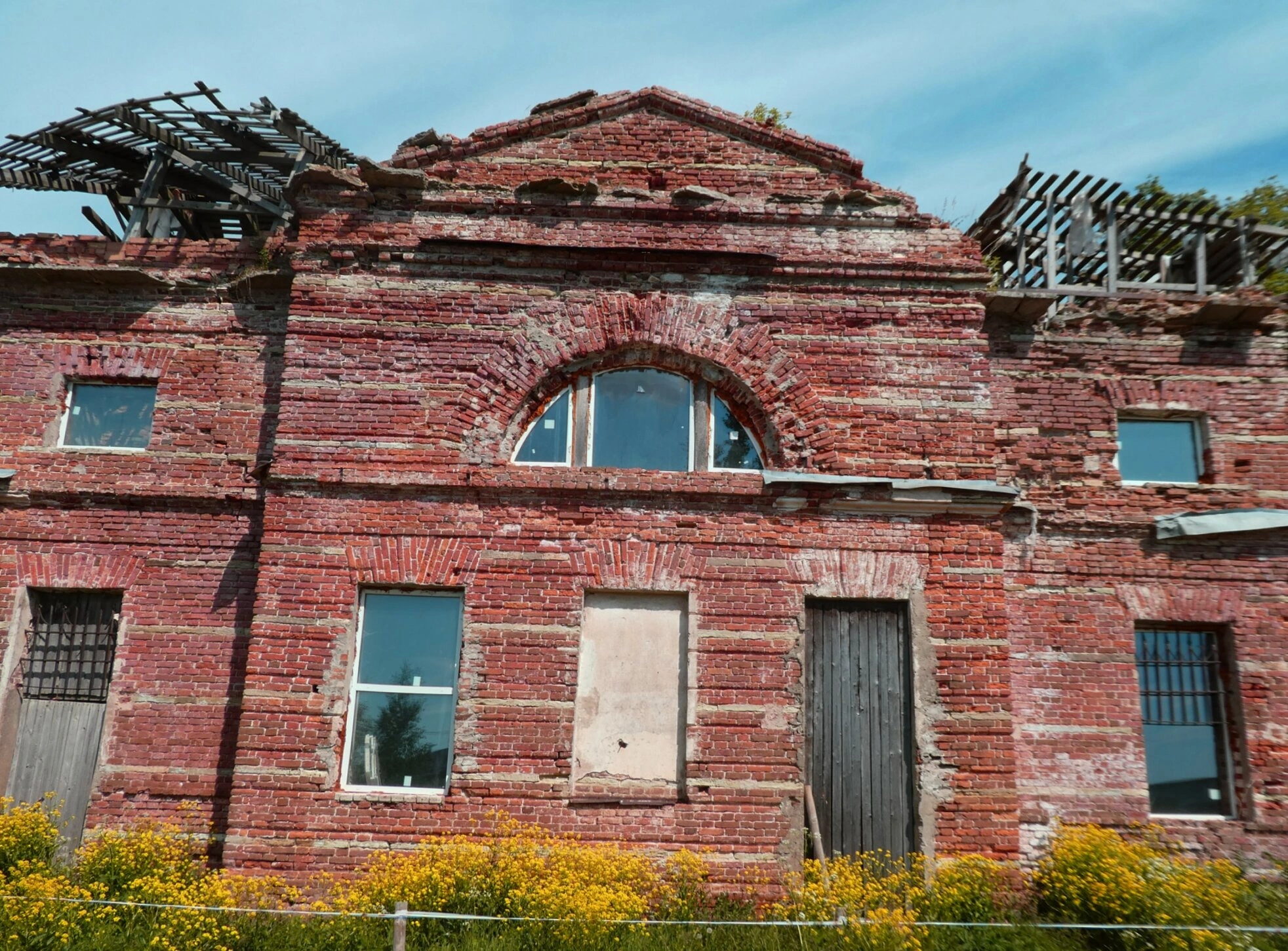 Состояние здания на момент съёмки вызывает глубокую печаль. Частично обрушенная кровля обнажает деревянную обрешётку, что ведёт к постепенному разрушению сводов под воздействием непогоды. Фасад храма скрыт за густыми зарослями жёлтых полевых цветов и зелёной травы, подчёркивающими атмосферу забвения этого святого места.