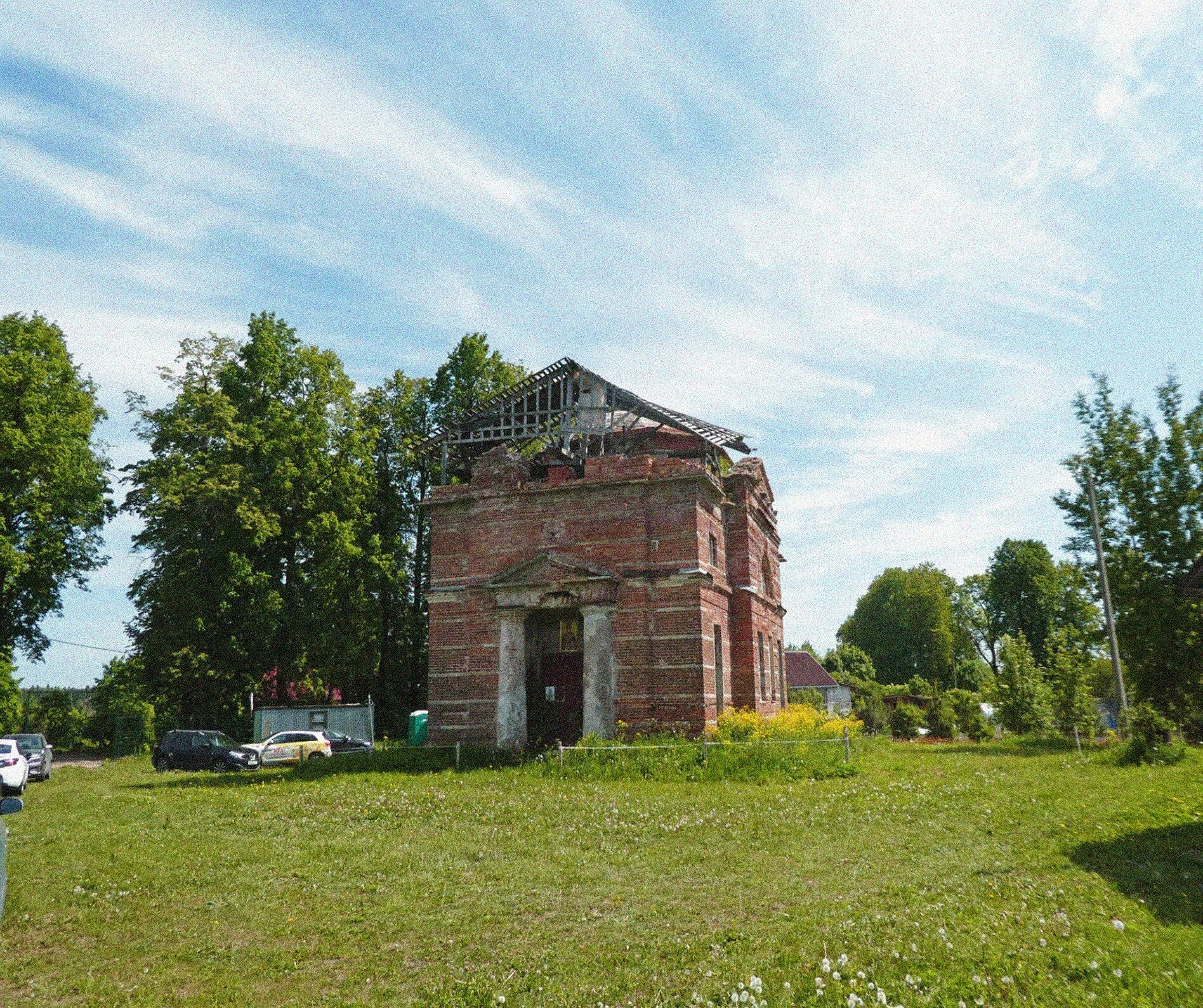 На снимке зафиксирован печальный, но исполненный благодати образ храма-мученика. Частично обрушившиеся своды и кровля обнажают внутреннее пространство, где некогда возносились молитвы. Кирпичные стены, испещрённые трещинами, стойко выдерживают натиск времени и непогоды. Несмотря на запустение, угадываются строгие классические формы здания, его симметричные пропорции и былые архитектурные детали.