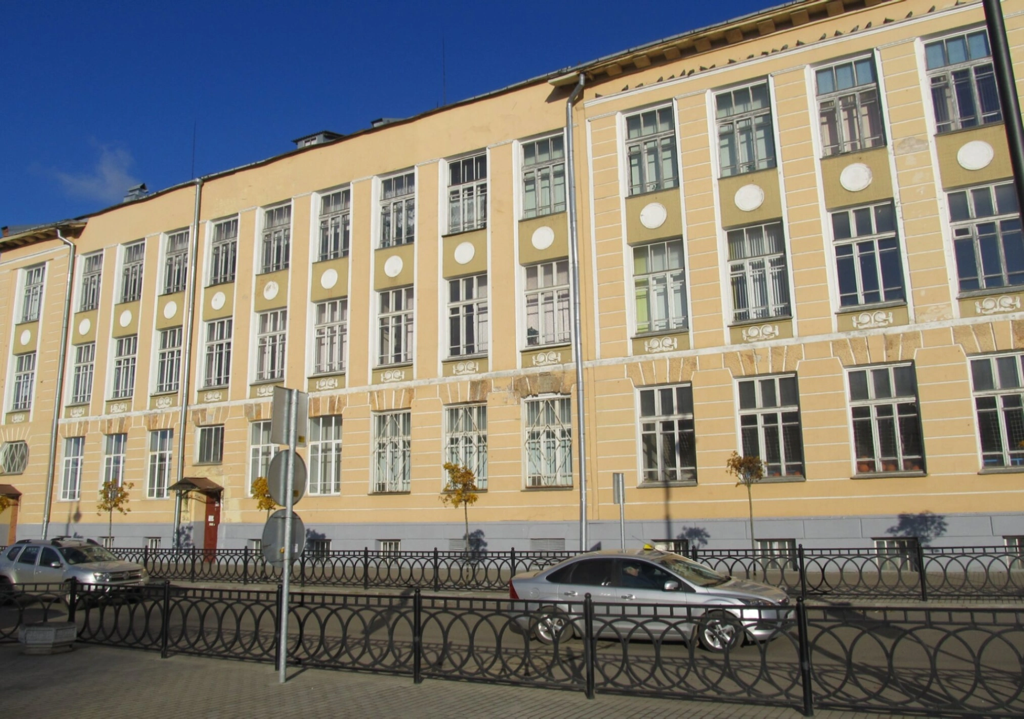 Архитектура храма на фото, сохраняющая элементы старинной часовни, являет собой образец скромного, но благолепного церковного зодчества. Здание, вытянутое в длину, имеет три основных этажа и мансардный уровень. Фасад, окрашенный в тёплый светло-персиковый цвет, украшен белыми декоративными элементами вокруг окон и между этажами, что создаёт ощущение чистоты и устремлённости ввысь. Множество высоких прямоугольных окон с белыми рамами, расположенных ровными рядами, наполняют внутреннее пространство Божьим светом. На фотографии видно, что храм отделён от проезжей части чёрным металлическим забором, а ясное голубое небо с редкими облаками подчёркивает благодатную атмосферу, окружающую это святое место.