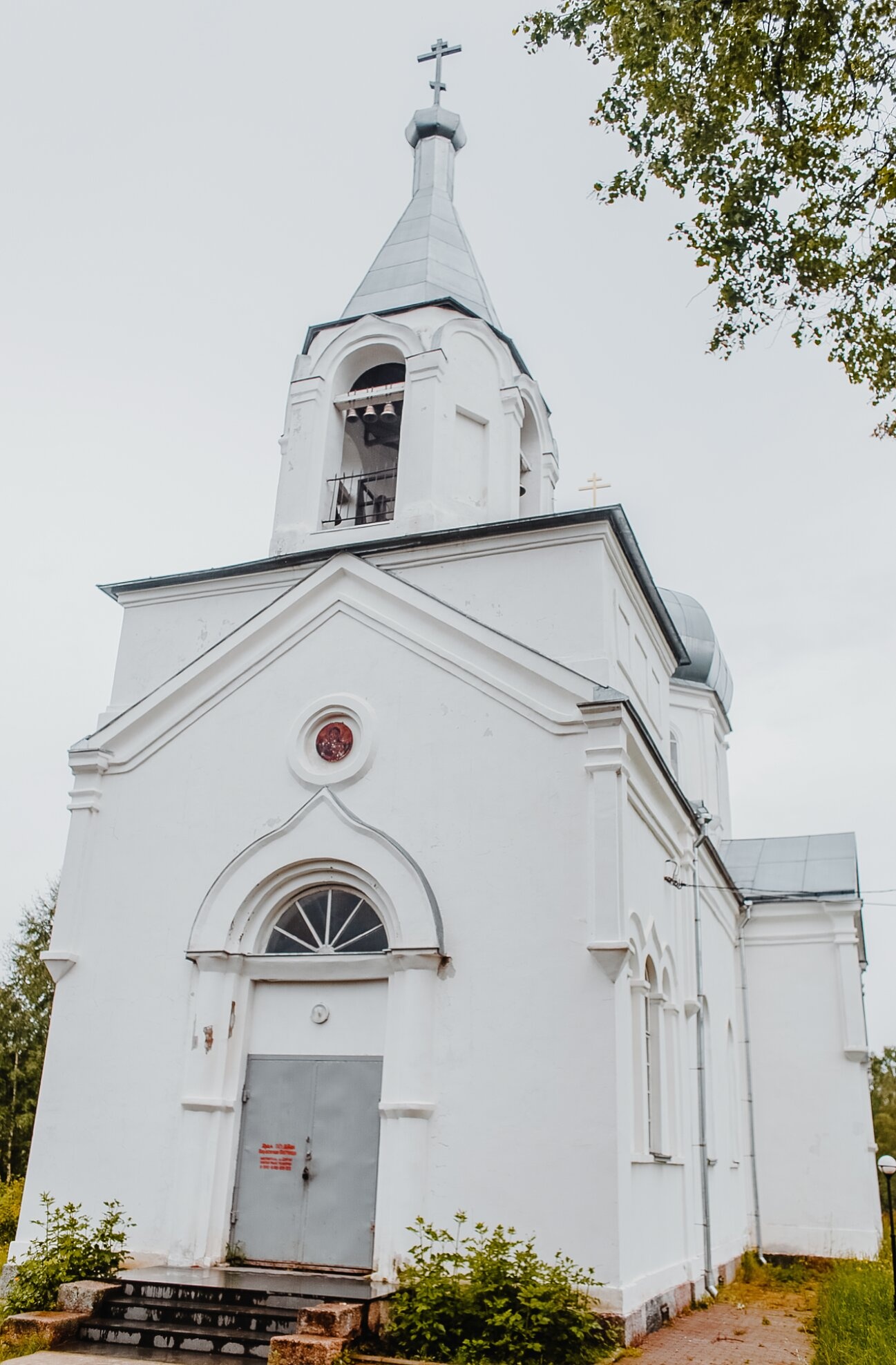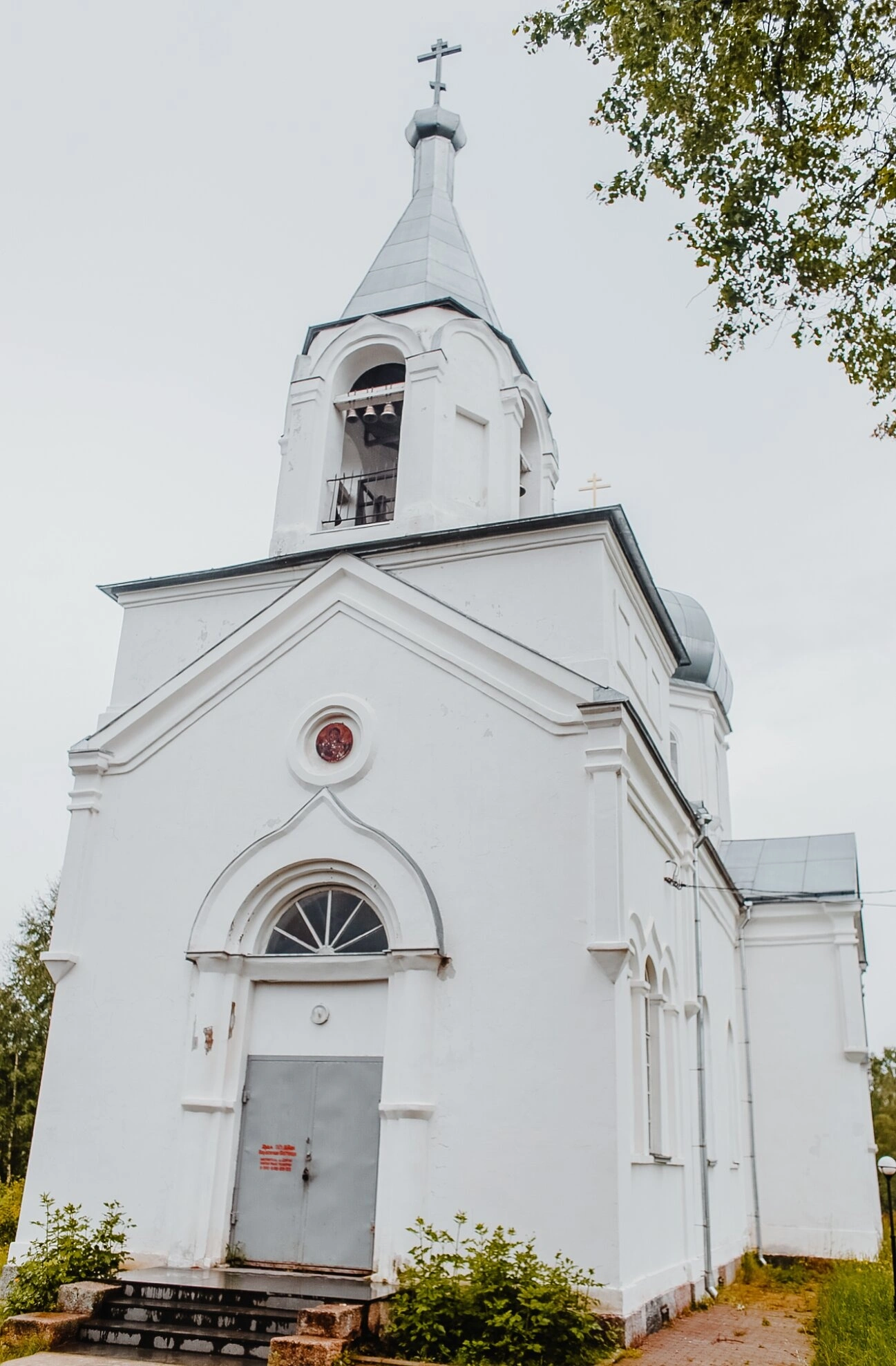 Основной объём храма увенчан традиционным куполом, символизирующим небесный свод, а над входом возвышается ярусная колокольня со шпилем, что придаёт всей постройке устремлённость ввысь. На переднем плане фотографии хорошо виден вход в церковь, обрамлённый порталом и ведущими к нему ступенями. Серые двустворчатые двери приглашают верующих внутрь для молитвы.