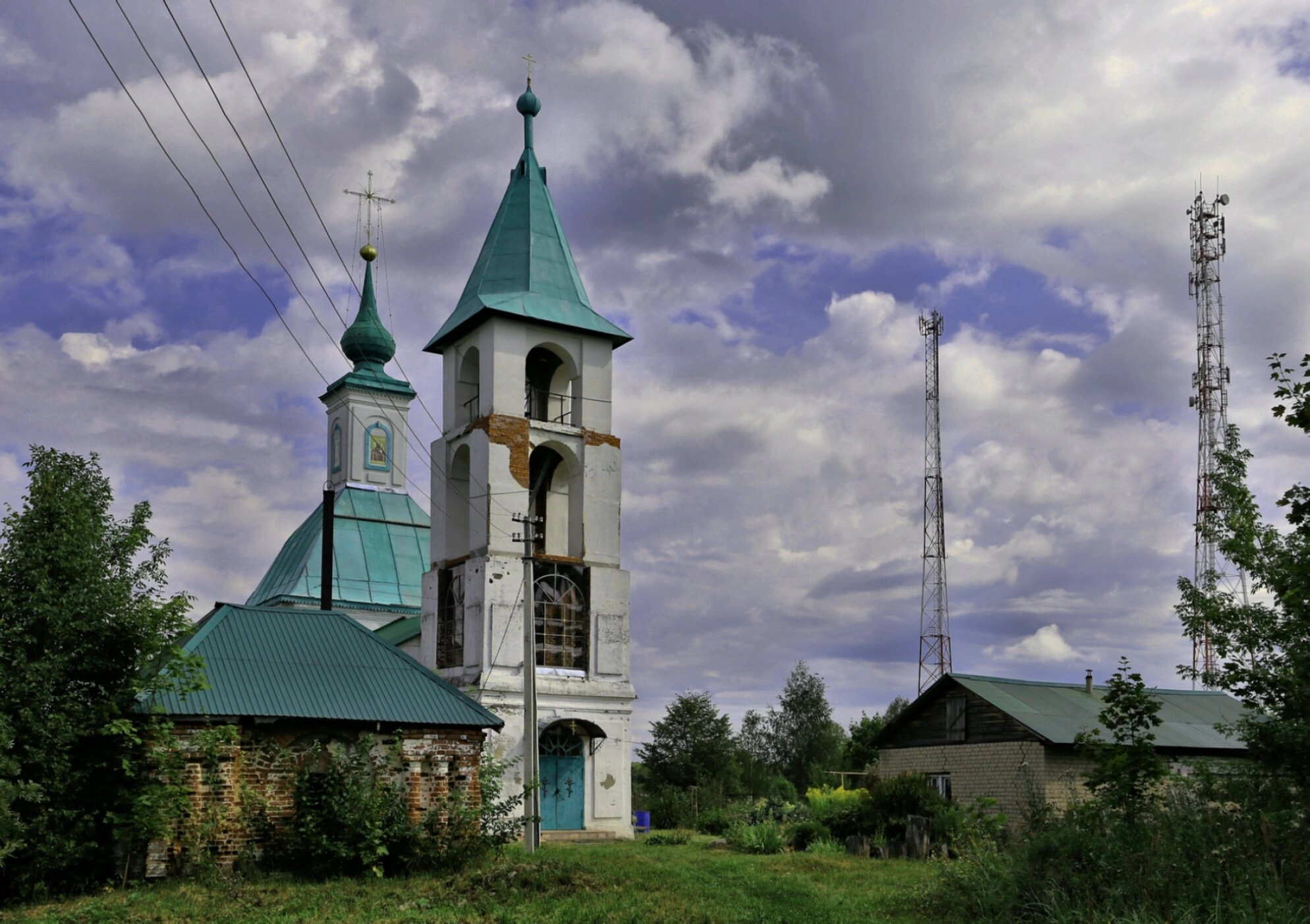 На снимке также видны хозяйственные постройки и современные вышки связи, что создаёт уникальный контраст между вечным и временным, подчёркивая непреходящее значение духовных ориентиров. Пасмурное небо с облаками добавляет фотографии настроение созерцательности и лёгкой грусти, навевая мысли о быстротечности земного бытия и вечности души.