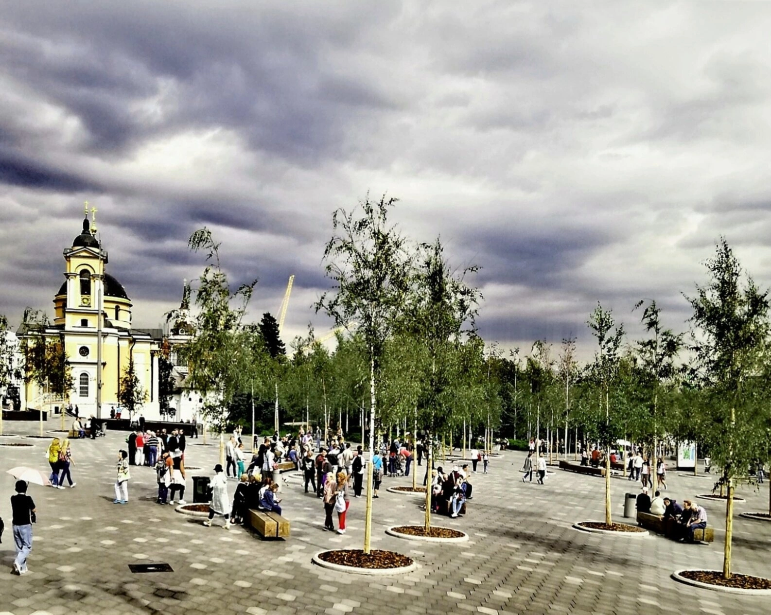 На представленной фотографии запечатлён вид на одну из старейших московских святынь – храм Святой Великомученицы Варвары, расположенный в историческом районе Зарядье на улице Варварка. Снимок сделан с обновлённой благоустроенной площади, где прогуливаются москвичи и гости столицы.