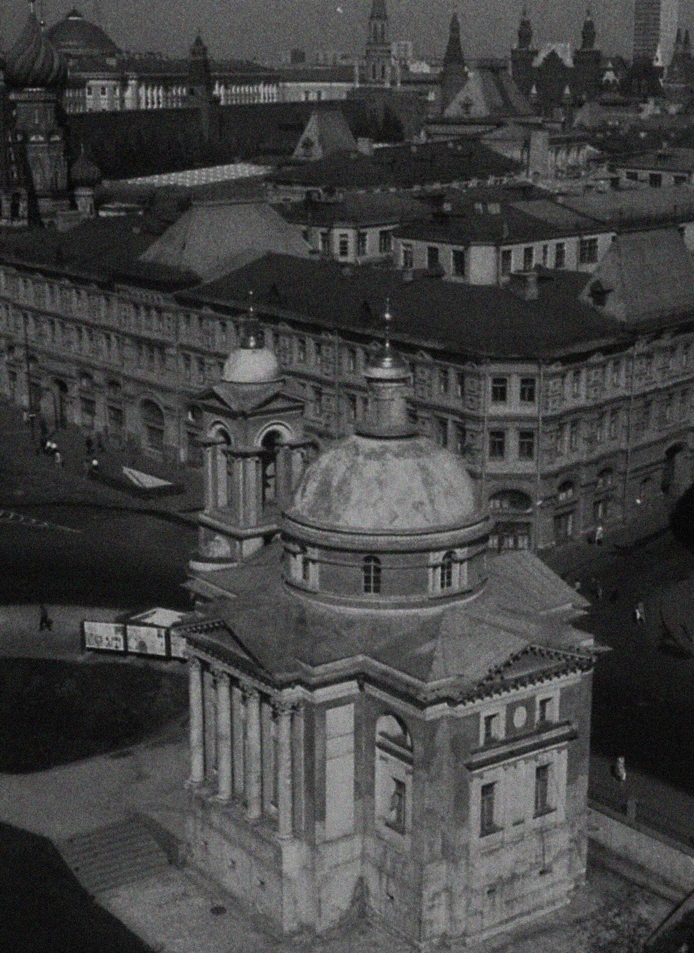 На представленной чёрно-белой фотографии запечатлён храм Святой Великомученицы Варвары, расположенный в историческом центре Москвы на улице Варварке. Снимок сделан в 1971 году с возвышенности, что позволяет оценить архитектурное величие святыни и её гармоничное вписывание в городской ландшафт столицы.