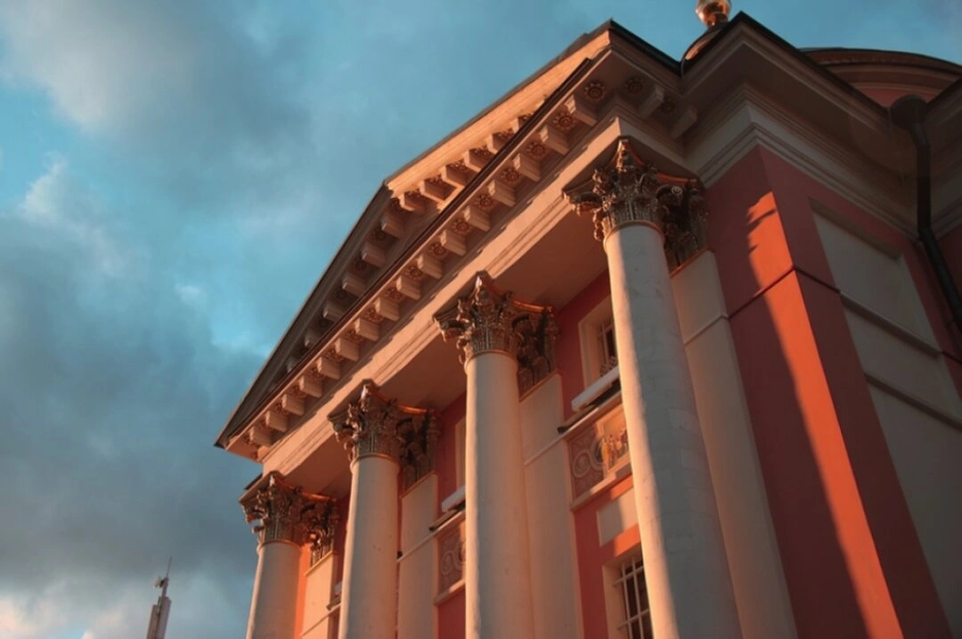 Колонны фасада, исполненные в благородных пропорциях, не только несут архитектурную нагрузку, но и воплощают идею стойкости в вере, проявленной святой великомученицей во время страданий. В христианской традиции колонны ассоциируются с духовной опорой и незыблемостью вероучения . Освещённый лучами солнца белокаменный фасад создаёт возвышенный образ, оттенённый драматичной красотой облачного неба, что напоминает о бренности земного бытия и вечной славе подвижников веры.