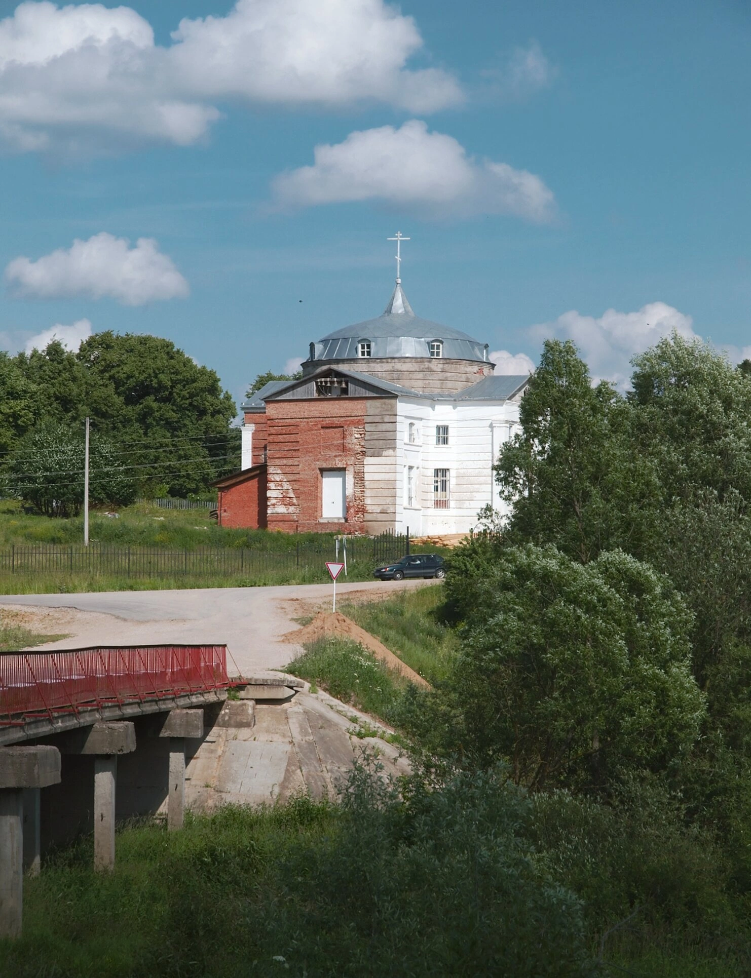 На переднем плане фотографии виден мост, перекинутый через русло реки Протвы, на берегу которой исторически стоит село. К церкви ведет грунтовая дорога, а густая зелень деревьев и кустарников обрамляет пейзаж, подчеркивая единение творения рук человеческих и Божьего мира. Присутствие автомобиля у храма свидетельствует о том, что и в наши дни к этой святыне не прекращается поток верующих.