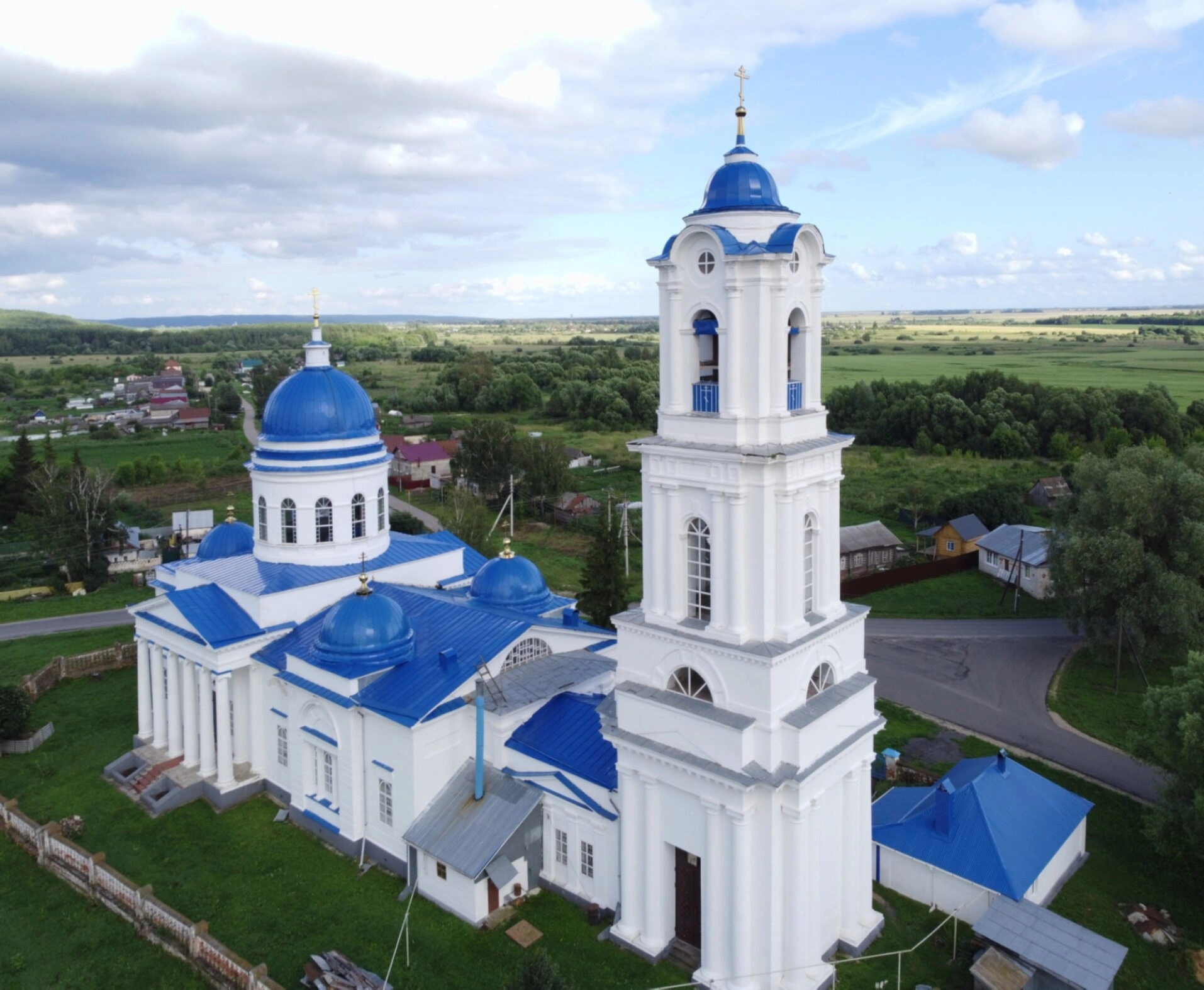 Ряд с главным зданием возвышается стройная колокольня, завершающаяся таким же сияющим куполом. Её арочные проёмы предназначены для церковных колоколов, благовест которых разносится над окрестными полями и лугами, созывая православных верующих на молитву. Храмовой комплекс обнесён аккуратной оградой и окружён ухоженной территорией, что отражает заботу прихожан о своей святыне. На заднем плане открывается типичный для русской глубинки пейзаж: скромные деревенские дома, утопающие в зелени деревьев, и бескрайние просторы полей, уходящие к линии горизонта. Небесный свод, покрытый лёгкими облаками, освещён мягким светом, создающим атмосферу благодатного и спокойного дня. Общий вид передаёт незыблемый дух православной веры, мирное течение сельской жизни и неразрывную связь храма с окружающей его природой и людьми.