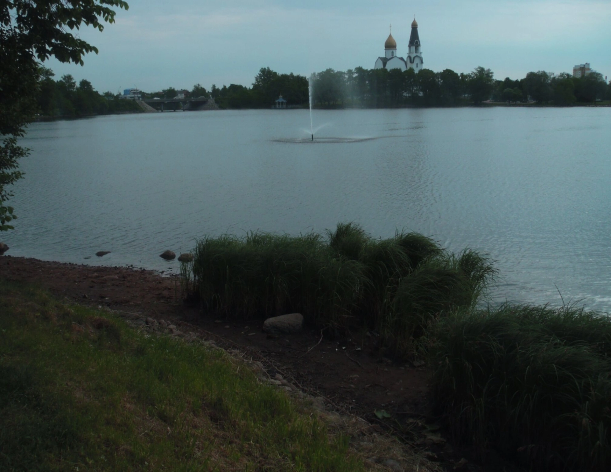 В центре композиции находится действующий фонтан, чьи струи создают динамичный акцент на спокойной поверхности водохранилища. За водным пространством возвышается величественный Храм Святых апостолов Петра и Павла – православная святыня Сестрорецка. Белоснежные стены храма и золотые купола гармонично сочетаются с окружающим природным ландшафтом.