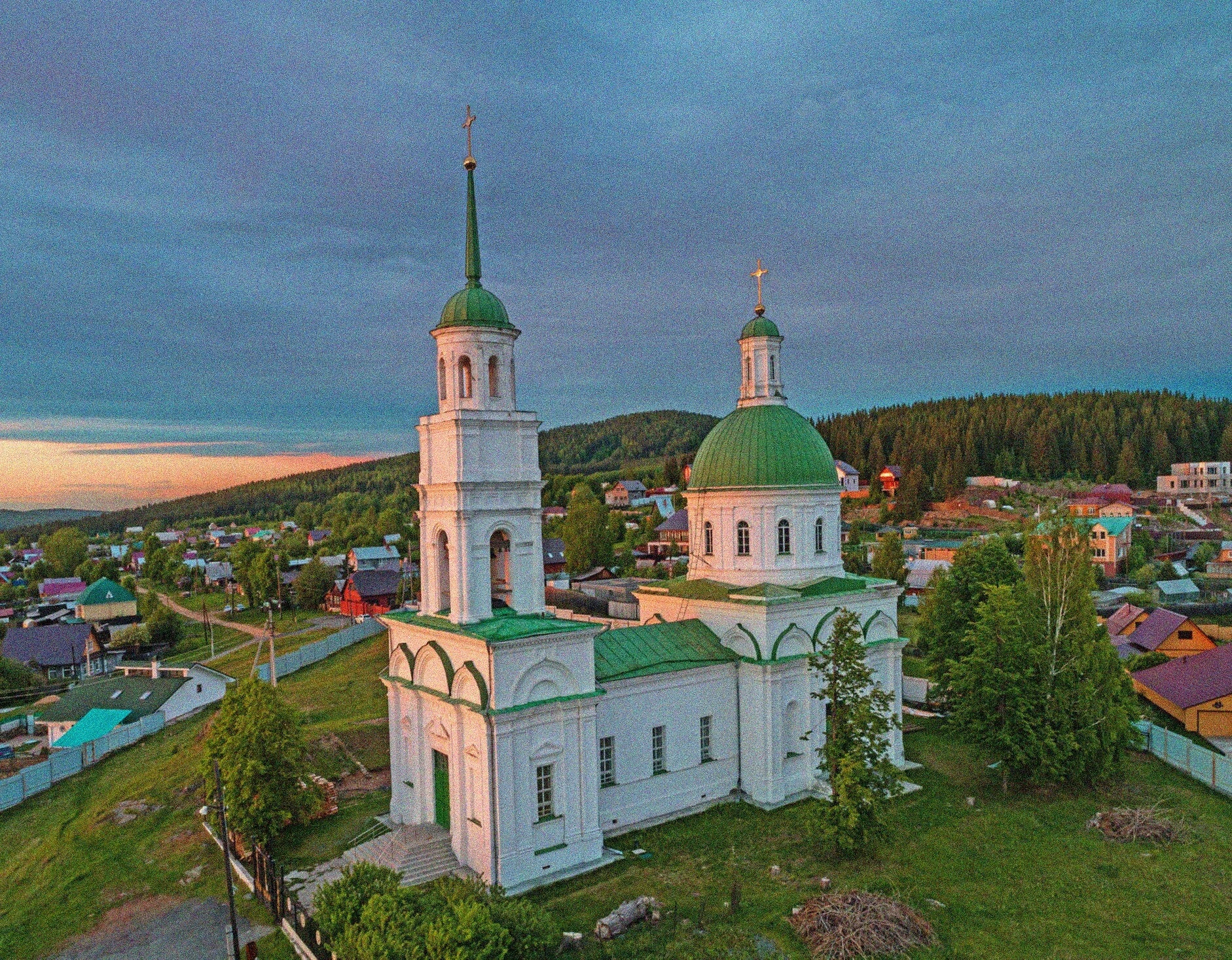 На заднем плане открывается вид на жилые дома посёлка, утопающие в зелени, и бескрайние лесные просторы, характерные для уральской природы. Небо, окрашенное в мягкие пастельные тона заката, добавляет изображению особую духовную возвышенность и tranquility.