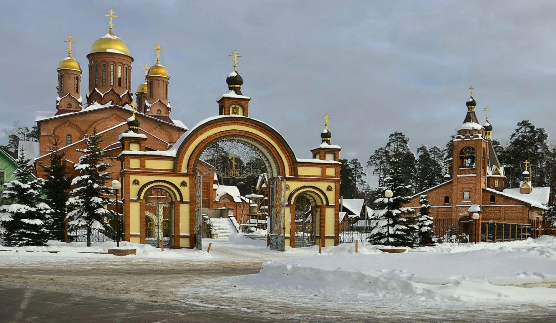 Перед главным входом в храм расположена массивная арочная конструкция, служащая одновременно и воротами, и элементом оформления подворья. Вокруг церковной территории видны заснеженные ели и хвойные деревья, которые подчеркивают уединенность и духовную сосредоточенность этого места. Рассеянный свет зимнего облачного неба мягко освещает золотые главы и кирпичные стены, придавая изображению особую светлоту и глубину.
