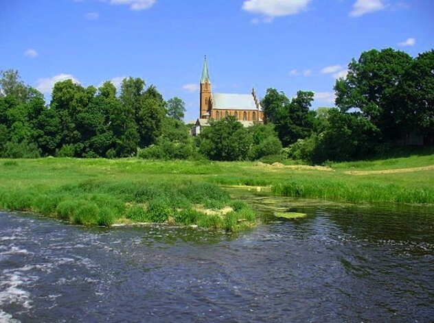 На представленной фотографии запечатлён величественный вид православного храма в честь святых апостолов Петра и Павла, расположенного в городе Краснознаменске Калининградской области. Святыня стоит на живописном берегу реки Шешупе, что придаёт ей особую духовную и эстетическую значимость.