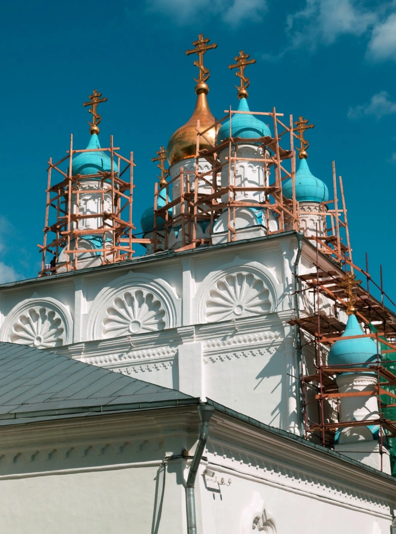 На фотографии запечатлён величественный православный храм во имя святых первоверховных апостолов Петра и Павла, что располагается в историческом районе Москвы Лефортово. Это один из старейших храмов столицы, являющийся ярким памятником церковной архитектуры и духовным центром.