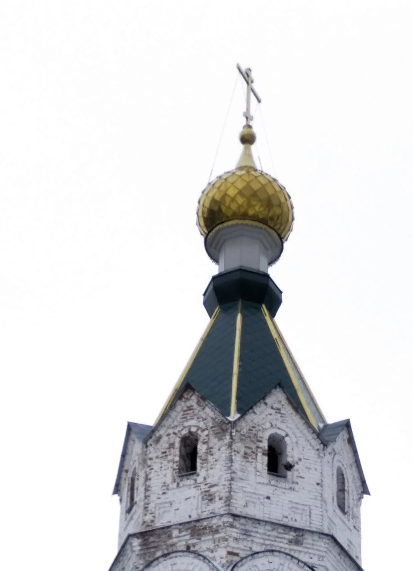 Венчает колокольню шатровая кровля, окрашенная в благодатный зелёный цвет, что символизирует вечную жизнь и обновление души. Над шатром возносится изящный золотой купол, выполненный в традиционной для русского храмового зодчества луковичной форме. Этот купол, сияющий в лучах солнечного света, олицетворяет собой горний мир и устремлённость молитвы к Богу. Он увенчан крестом — символом искупительной жертвы Христа Спасителя и победы жизни над смертью.