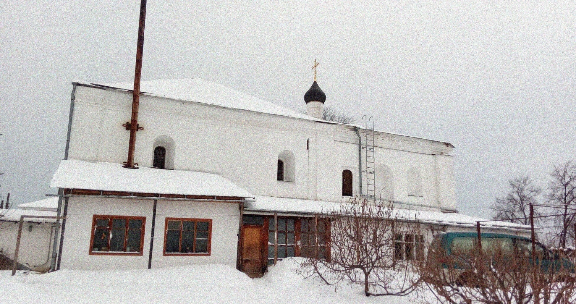 С левой стороны от храма возвышается высокая труба, что указывает на наличие церковного дома или иного хозяйственного сооружения, необходимого для жизни прихода. Наличие припаркованного транспортного средства в правой части кадра говорит о том, что даже в зимнюю пору в храме совершаются богослужения и его посещают верующие.
