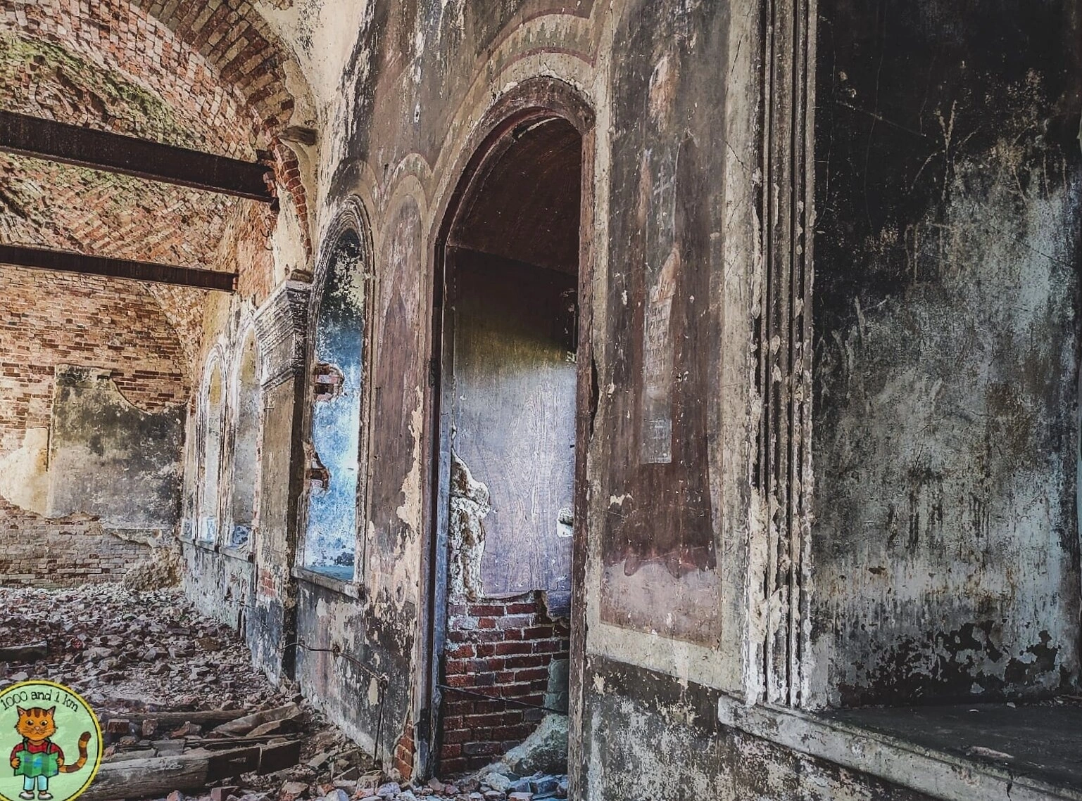 В архитектурных деталях просматриваются арочные дверные проемы и ниши, в которых прежде, вероятно, располагались оконные проемы. Внутреннее пространство храма и прилегающая территория покрыты фрагментами кирпича, штукатурки и деревянных конструкций, что свидетельствует о длительном периоде запустения. Несмотря на утрату былого благолепия, памятник сохраняет величественную красоту и особую атмосферу, напоминающую о его духовном предназначении.