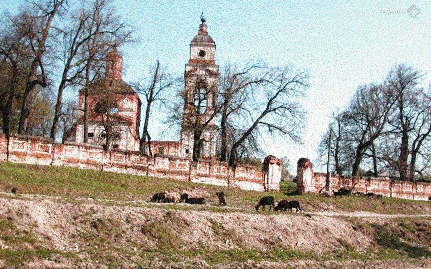 Центром композиции выступает высокая колокольня, увенчанная шпилем, которая, несмотря на значительные разрушения, продолжает горделиво устремляться в небо. Рядом просматривается массивный световой барабан и остатки главного купола, под которым прежде располагалось пространство храма. Строения сложены из красного кирпича, и по сей день поражающего своей прочностью, однако время и забвение наложили на них свой суровый отпечаток: кладка местами обрушена, своды провалились, а оконные проёмы зияют пустотой.