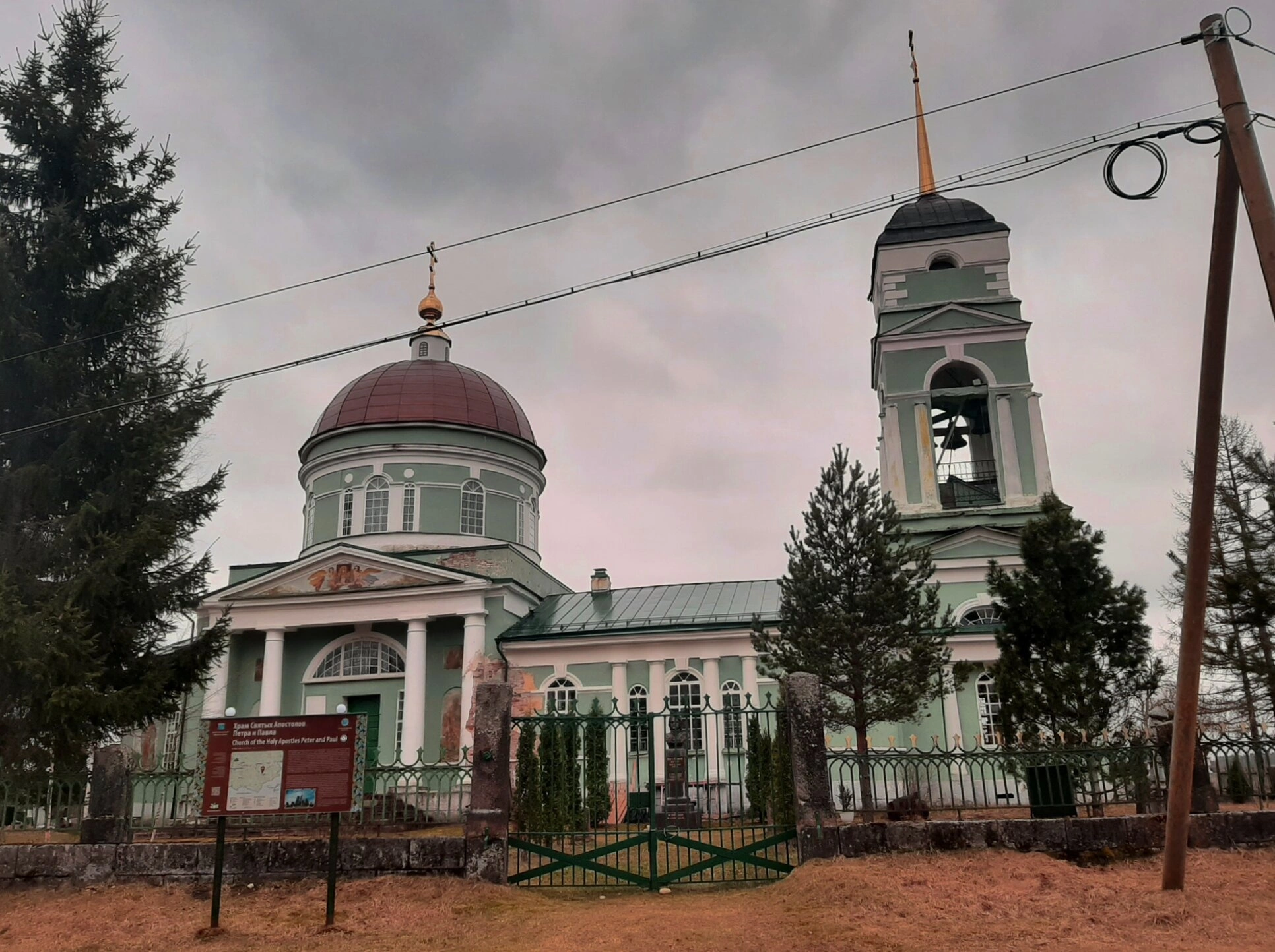 Деревянный храм во имя святых апостолов Петра и Павла был основан в 1871 году и освящён для прихожан окрестных деревень. Церковь была построена на средства местных благотворителей и усердием православных крестьян. Архитектурный облик храма характерен для русского деревянного зодчества второй половины XIX века, с присущей ему строгостью форм и традиционным завершением в виде луковичной главки, увенчанной православным крестом.