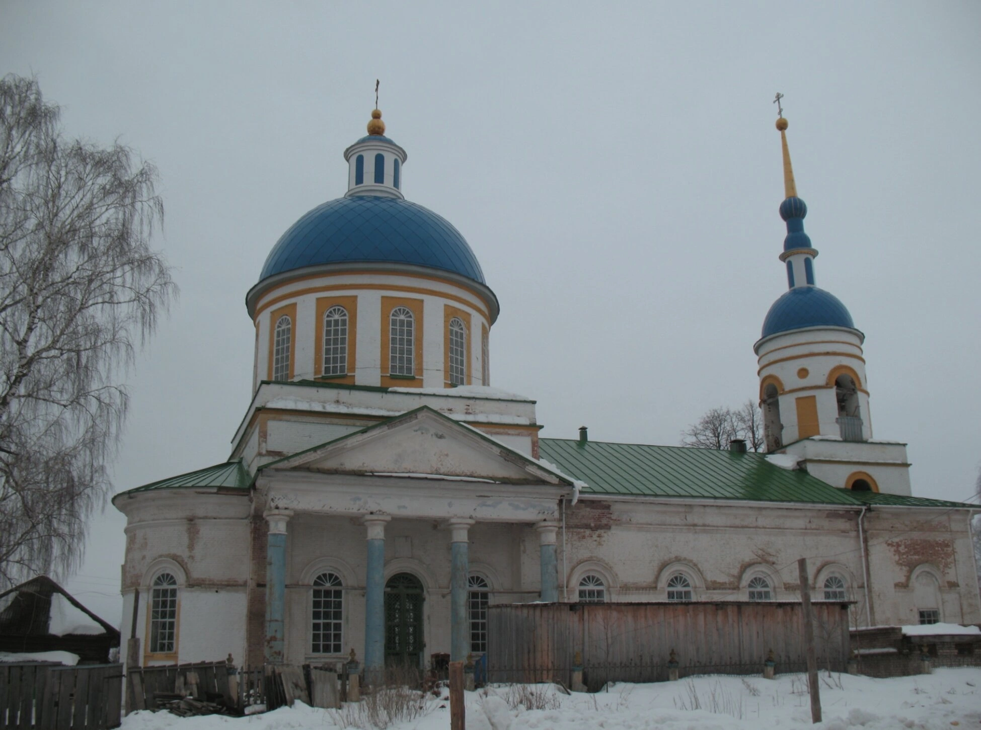 На представленной фотографии запечатлен зимний вид православного храма во имя святых славных и всехвальных первоверховных апостолов Петра и Павла, расположенного в селе Тыловыл-Пельга Киясовского района Удмуртской Республики. Снежный покров, укутавший землю, и отсутствие листвы на деревьях создают атмосферу благоговейной тишины и спокойствия, свойственной православным святыням в зимнее время.