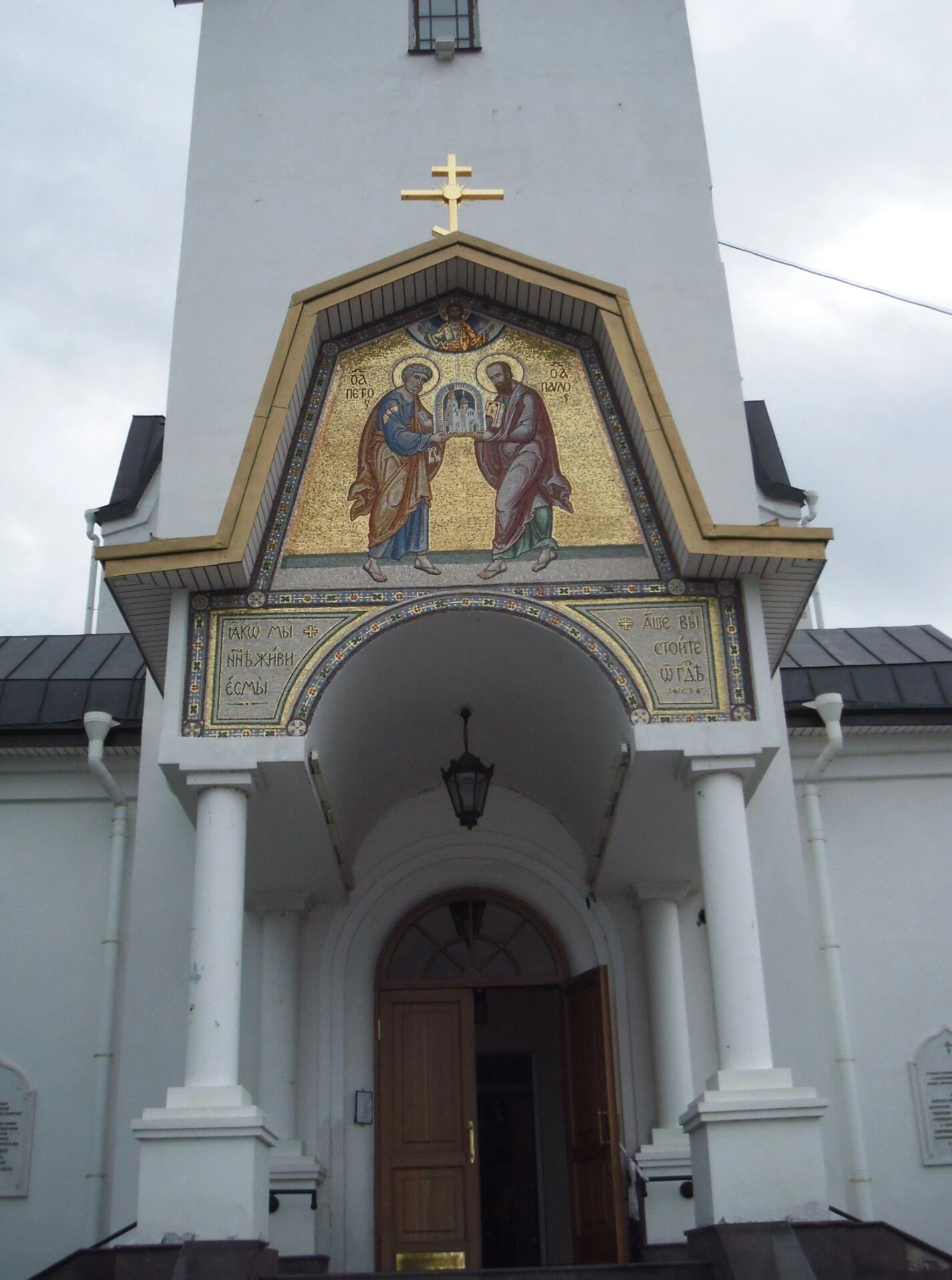 Центральным элементом композиции является прекрасная мозаичная икона святых апостолов Петра и Павла, выполненная в традиционной византийской технике с применением золотой смальты. Святые образы размещены в киотной арке над главным входом в храм, символически встречая верующих перед входом в дом Божий.