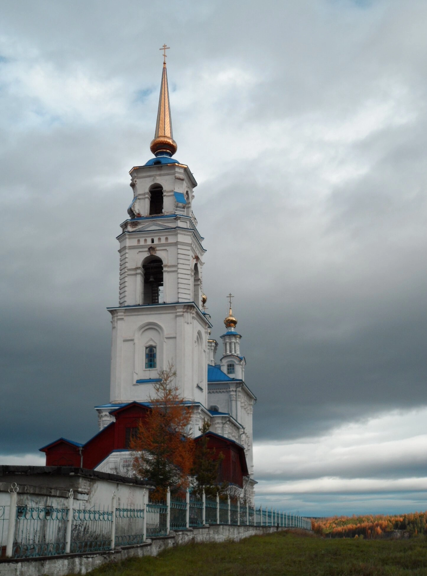Снимок сделан в осеннюю пору, о чём свидетельствует багряная листва деревьев, обрамляющих склоны близлежащего холма. Пасмурное небо, затянутое облаками, создаёт особое настроение сосредоточенности и тишины, присущее северным землям. Ограждённая территория вокруг храма обозначает особый, священный статус этого места, отделяя его от суетного мира.