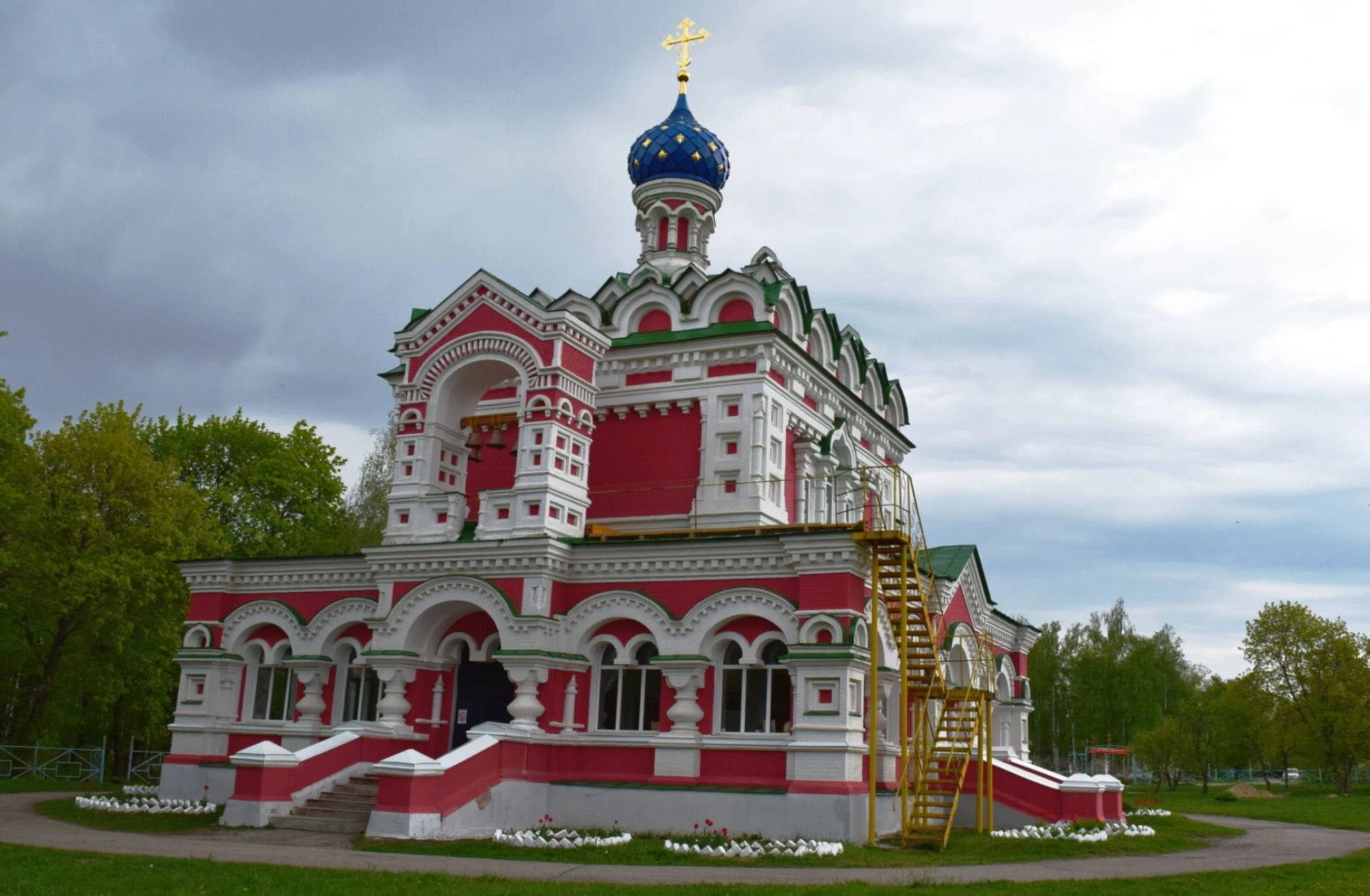 На представленной фотографии запечатлён храм в честь святых первоверховных апостолов Петра и Павла, расположенный в посёлке Старожилово Рязанской области. Святыня была возведена в 1892 году на средства благотворительницы Веры Николаевны фон Дервиз как фамильная церковь при конном заводе. Архитектурное решение храма представляет собой яркий образец псевдорусского стиля, получившего распространение в церковном зодчестве конца XIX века.