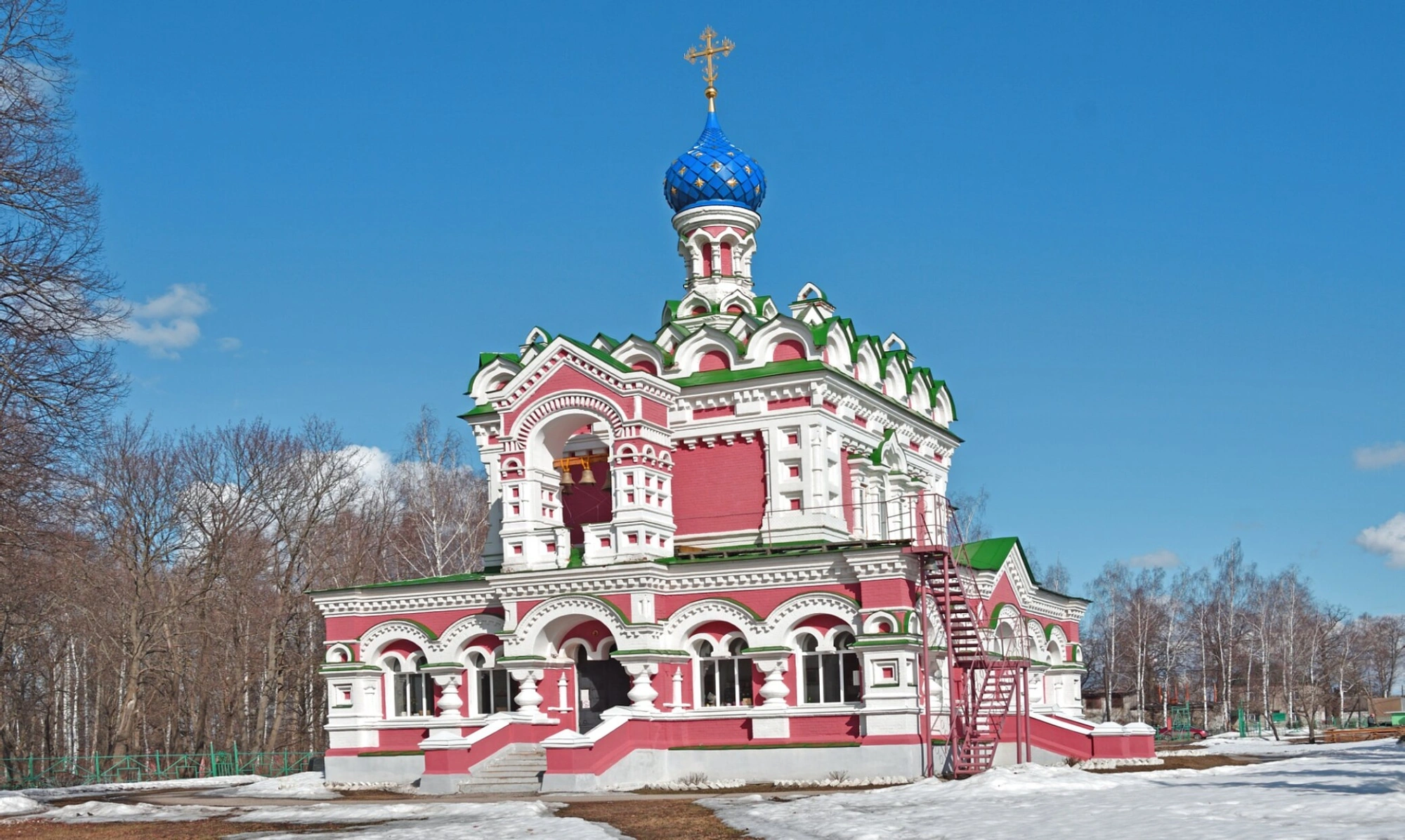 Фотография сделана в ясный зимний день, о чём свидетельствует голубое небо и чёткие тени, падающие от здания. Снежный покров, лежащий у подножия храма, придаёт снимку особую светлоту и чистоту, metaphorically напоминая о духовной чистоте и очищении. Деревья без листвы на заднем плане позволяют в полной мере рассмотреть великолепие архитектурных форм.