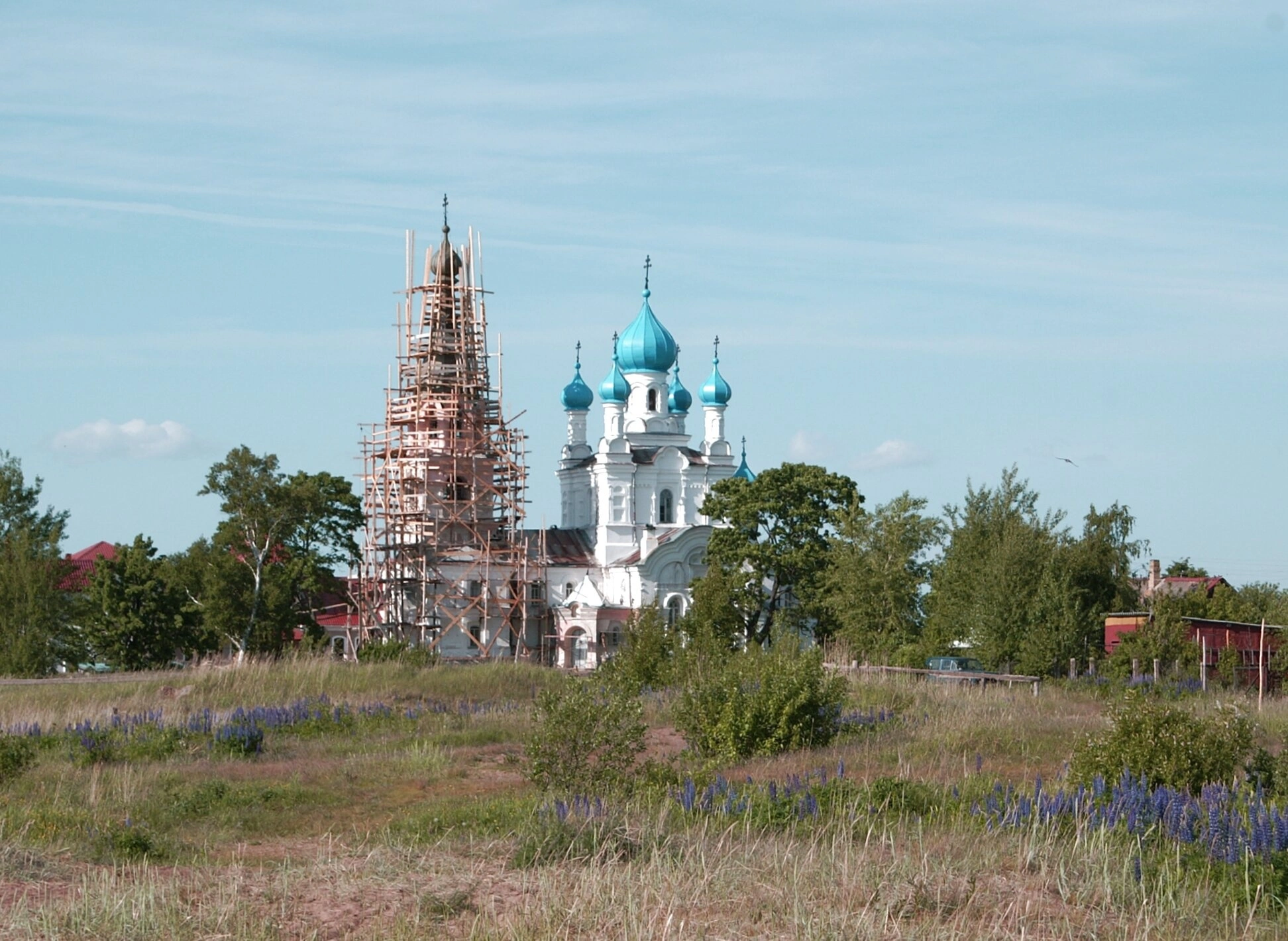 На переднем плане снимка видны полевые цветы, среди которых выделяются цветущие люпины, обрамляющие подход к святому месту и создающие особую, умиротворённую атмосферу. Центральную часть композиции занимает сам белоснежный храм, увенчанный небесно-голубыми куполами, символизирующими чистоту и устремлённость к горнему миру.
