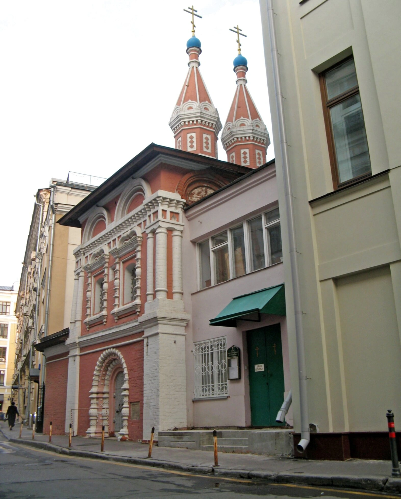 На представленной фотографии запечатлён старинный православный храм во имя святых бесребреников и чудотворцев Космы и Дамиана, что в Старых Панех. Эта церковь имеет древнюю историю и расположена в историческом центре Москвы, в Китай-городе, по адресу Старопанский переулок, дом 4.