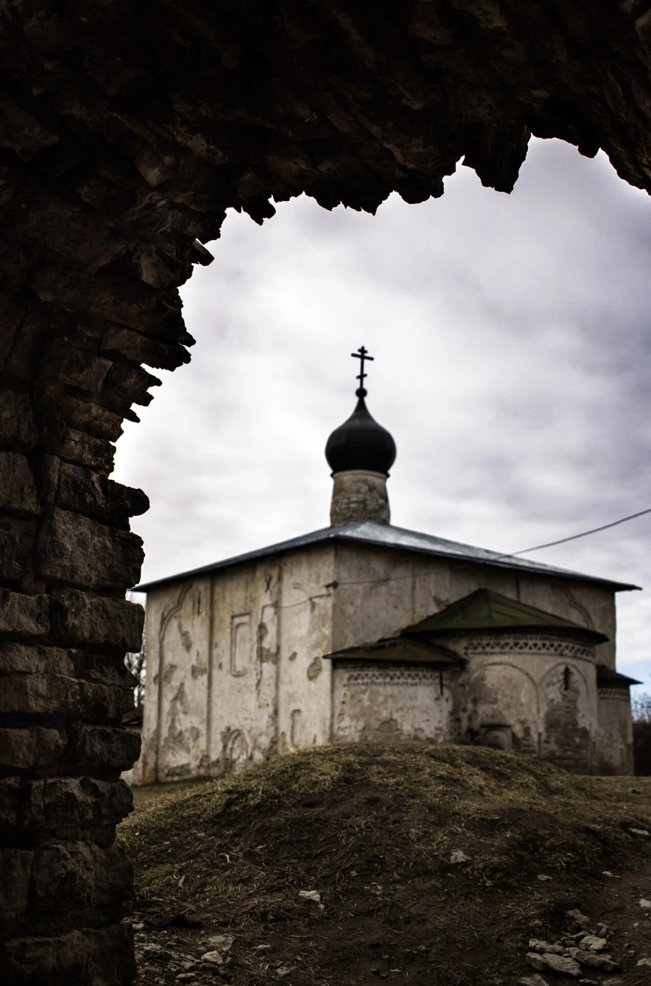 На представленной фотографии запечатлён древний православный храм во имя святых бессребреников и чудотворцев Космы и Дамиана, что расположен на историческом месте уединения — Гремячей горе в граде Пскове. Святая обитель, воздвигнутая в XVI столетии, является выдающимся памятником псковской архитектурной школы и несёт в себе дух древнего благочестия.