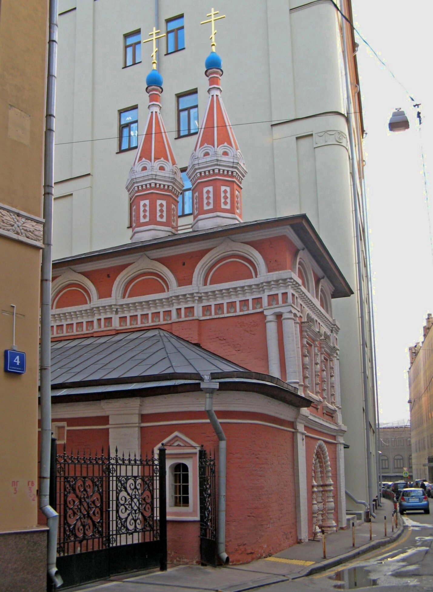 На представленной фотографии запечатлён православный храм во имя святых бессребреников и чудотворцев Космы и Дамиана, что в Старых Панех. Этот старинный московский храм имеет богатую историю, освящённую молитвой многих поколений верующих. Он расположен в историческом центре первопрестольной, в Китай-городе, по адресу: Старопанский переулок, дом 4.
