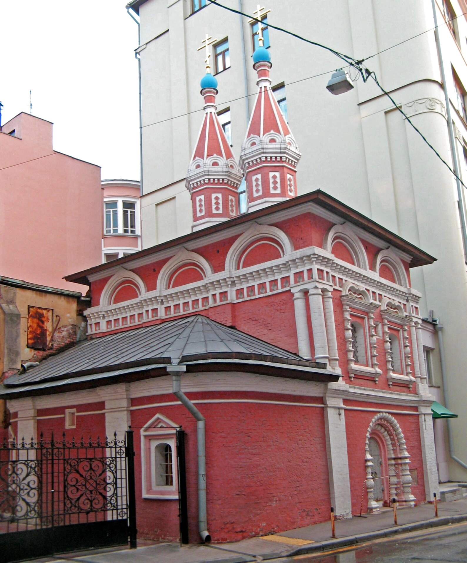 На представленной фотографии запечатлён старинный православный храм во имя святых бессребреников и чудотворцев Космы и Дамиана, что в Старых Панех. Святыня располагается в историческом центре Москвы, в Старопанском переулке, и является выдающимся памятником церковной архитектуры XVII столетия.