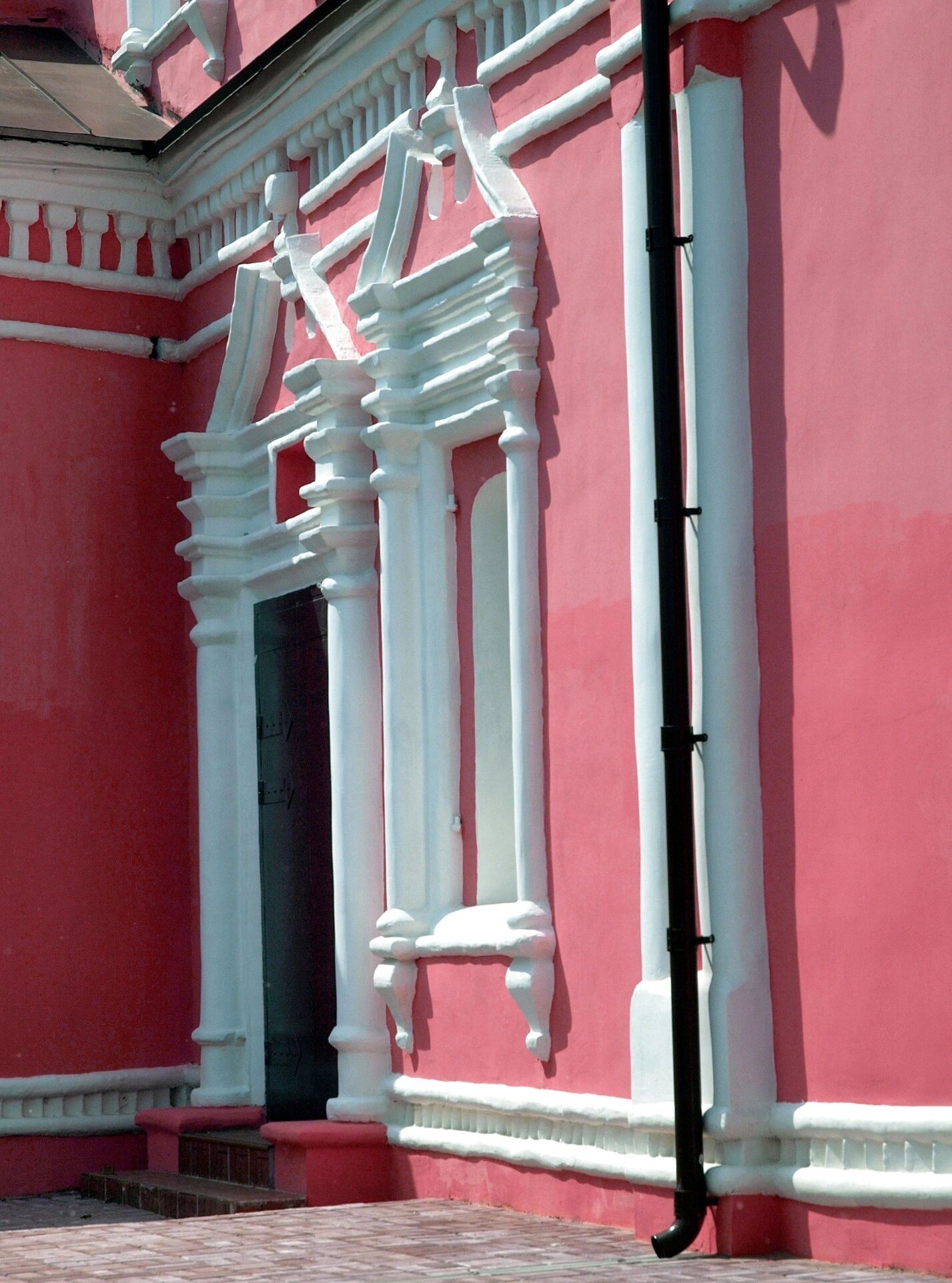 Церковь Святых Бориса и Глеба является одним из старейших каменных сооружений Боровска. Её история неразрывно связана с историей города и всей России. Архитектурный облик храма, который мы видим на снимке, характерен для русского церковного зодчества XVII-XVIII веков. На фотографии виден фрагмент стены храма, выполненной из красного кирпича и украшенной белоснежными декоративными элементами, наличниками и карнизами, что создаёт строгий и в то же время нарядный вид.