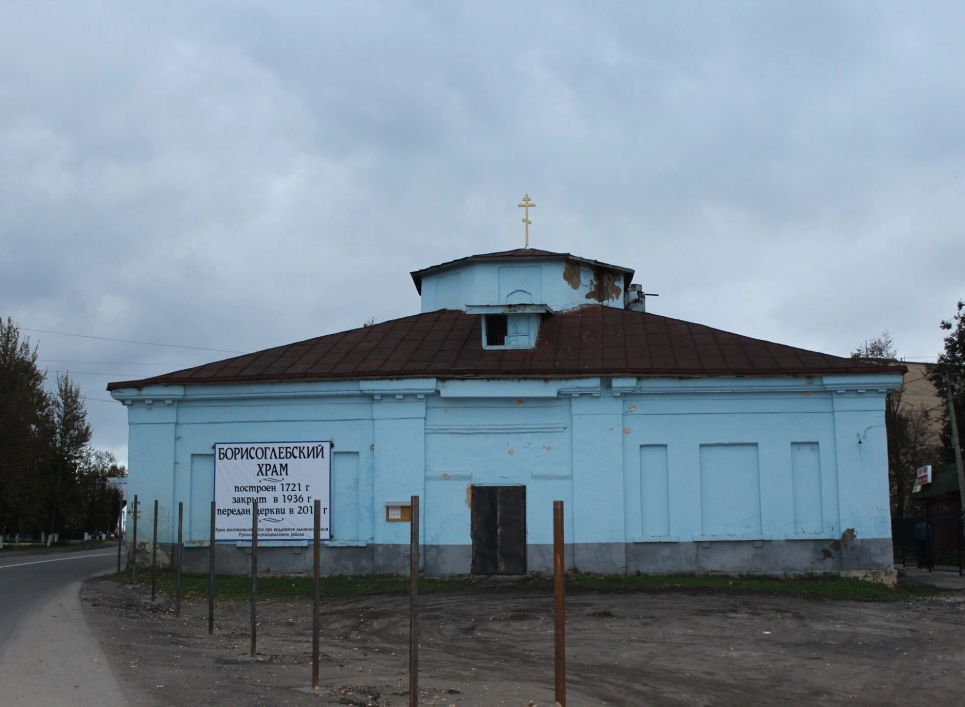 На представленной фотографии запечатлён храм во имя святых благоверных князей-страстотерпцев Бориса и Глеба, находящийся в древнем городе Рузе Московской области. Это один из старейших православных храмов на рузской земле, являющийся памятником церковной архитектуры первой четверти XVIII века.