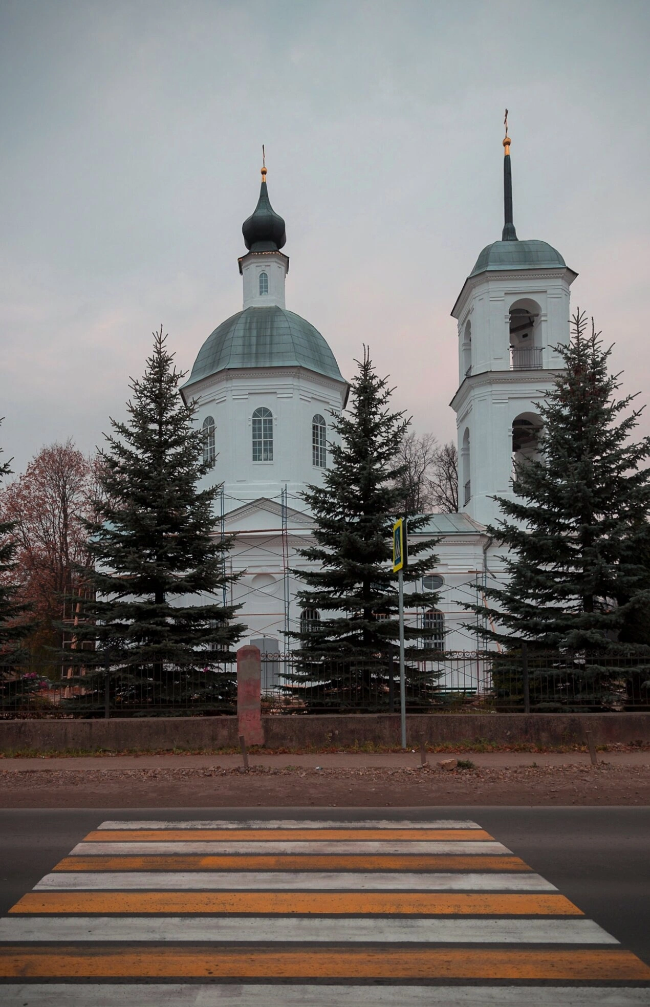На фотографии храм предстаёт в своём современном виде — ухоженным и готовым к принятию верующих. Его белые стены гармонично сочетаются с окружающим зеленым массивом высоких елей, создавая атмосферу молитвенного уединения и покоя. Перед храмом видна ограда, а на переднем плане — пешеходный переход, ведущий к святыне. Пасмурное серое небо подчёркивает благородство архитектурных форм и светлый образ этого дома Божия, уже более двух с половиной веков несущего своё служение.