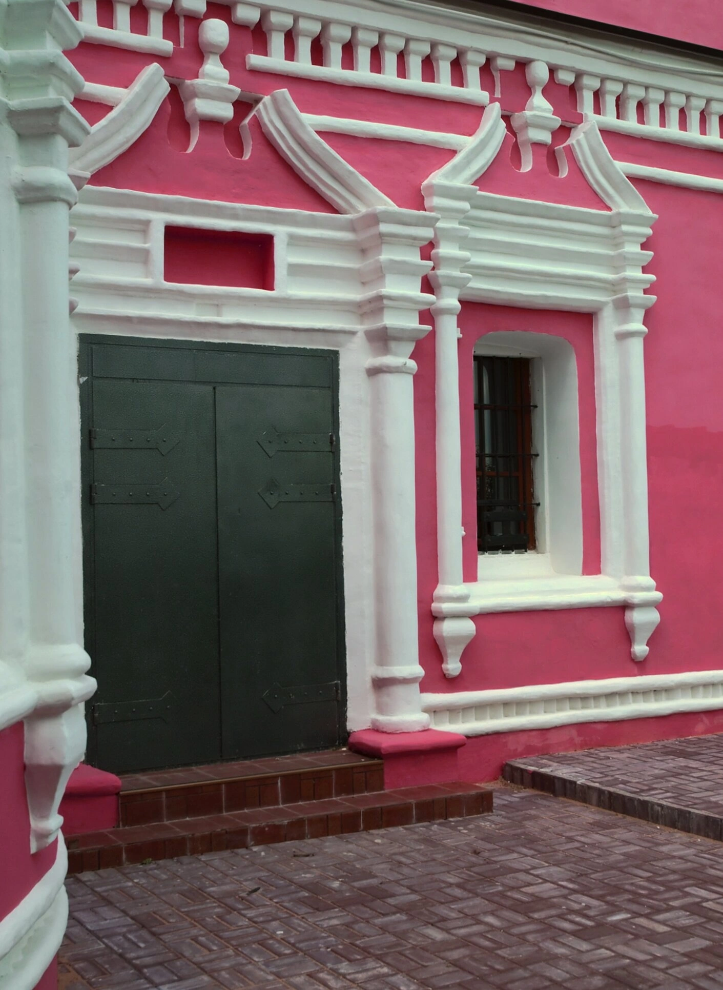 Справа от входа расположен оконный проём, защищённый ажурной кованой решёткой, выполненной в традиционном стиле. Стены собора, выкрашенные в насыщенный красный цвет — киноварь, что в православной традиции символизирует мученичество и царское достоинство святых, чьё имя носит церковь. Белоснежные декоративные элементы — наличники, колонны и карнизы — оттеняют глубину основного цвета и придают всему облику строения нарядность и строгое изящество.