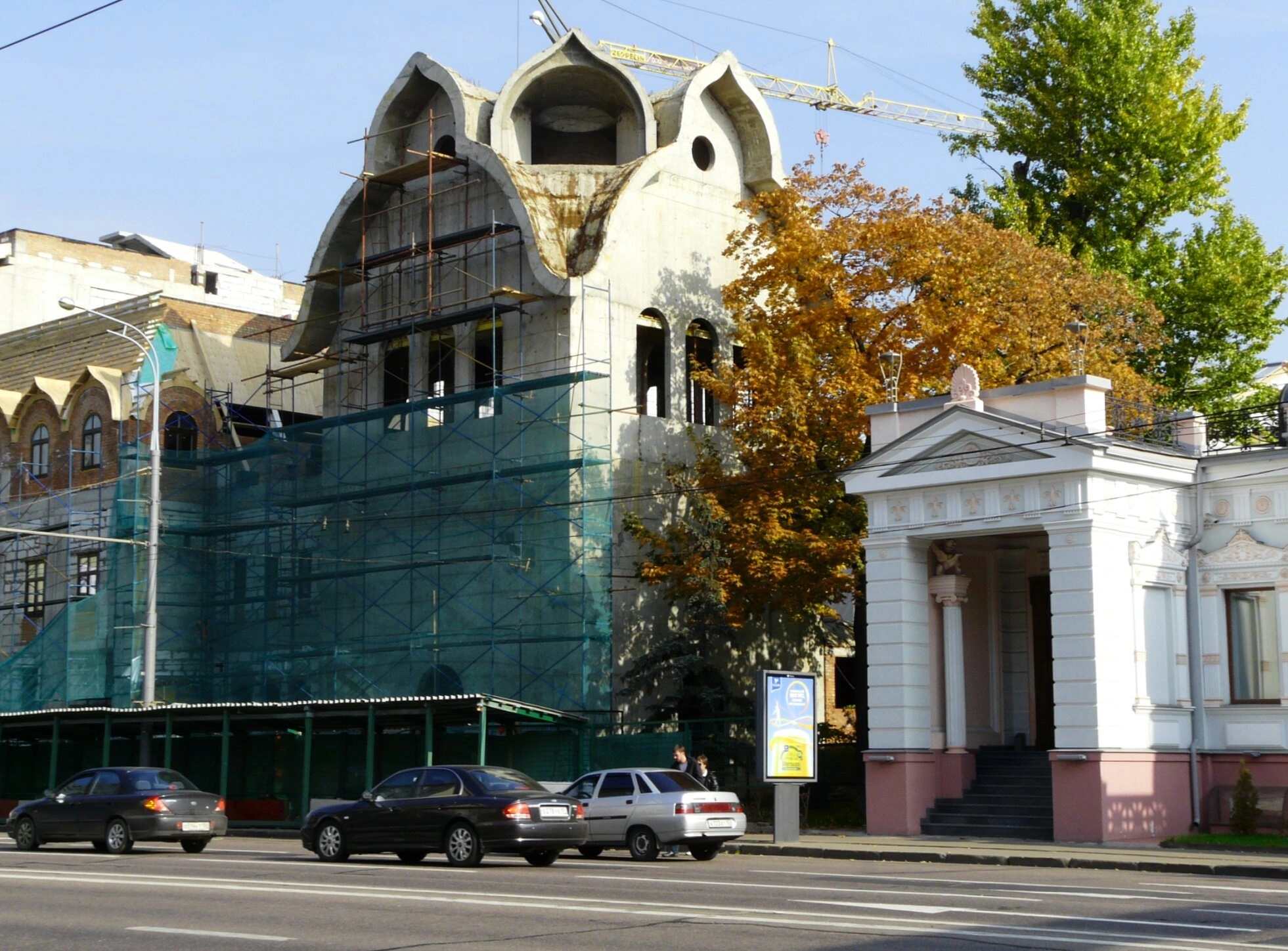 Возрождение поруганной святыни началось в 2003 году, когда здание было передано Русской Православной Церкви. На фотографии отражён один из ключевых этапов долгого пути восстановления былого благолепия. Ныне храм полностью отреставрирован, в нём регулярно совершаются богослужения, возносятся молитвы преподобному Серафиму Саровскому и святым женам Дивеевским. Окружающий храм городской пейзаж с проезжающими автомобилями и осенней листвой деревьев подчёркивает неразрывную связь вечных духовных ценностей и динамичной жизни современного мегаполиса.