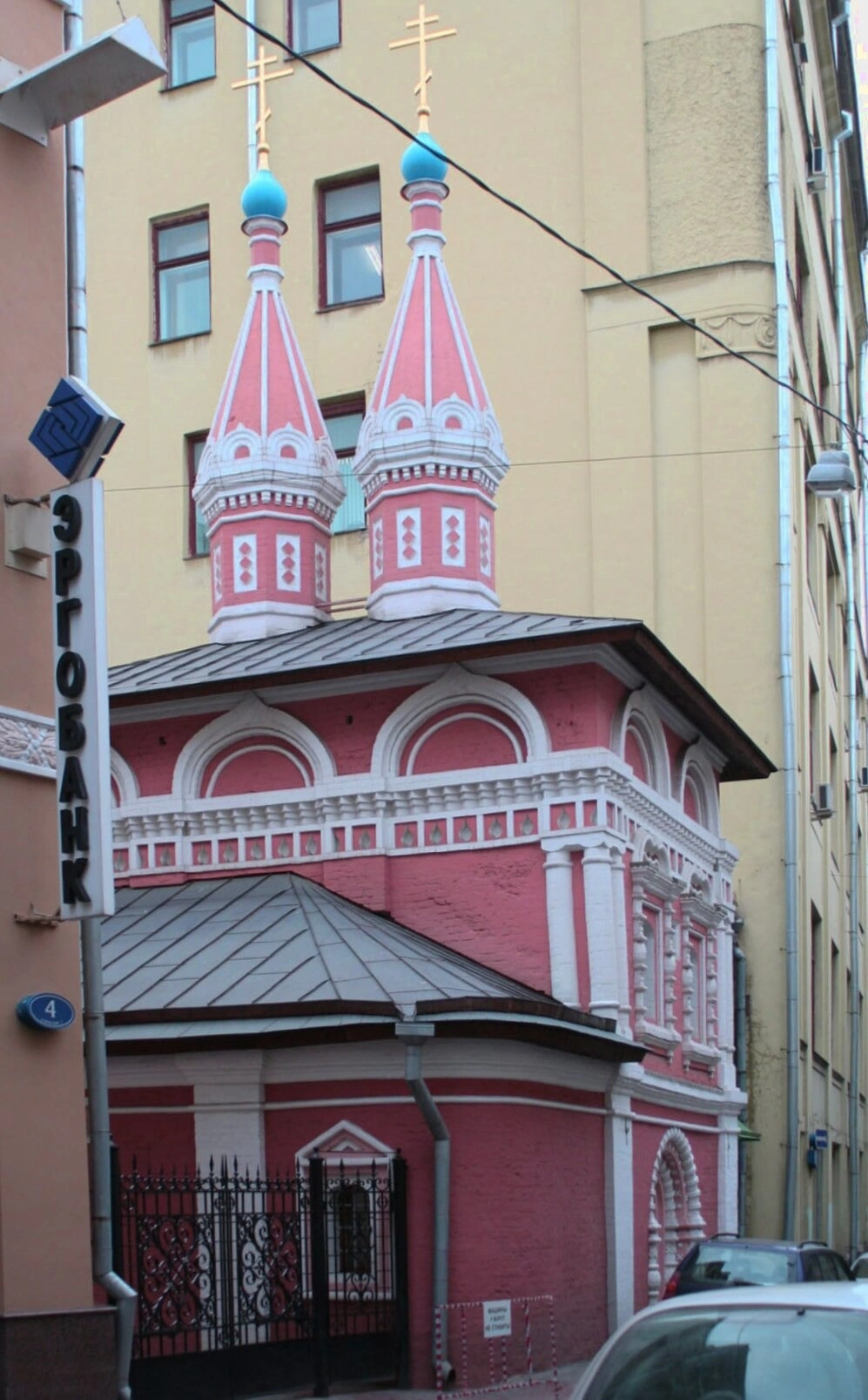 Храм окружает городская застройка, что подчёркивает его неразрывную связь с жизнью столицы на протяжении многих столетий. Рядом со святыней можно видеть элементы городской инфраструктуры, включая ограждение и припаркованные автомобили. На фотографии также заметна вывеска банковского отделения и табличка с номером дома, что указывает на точное местонахождение храма — Старопанский переулок, дом 4.