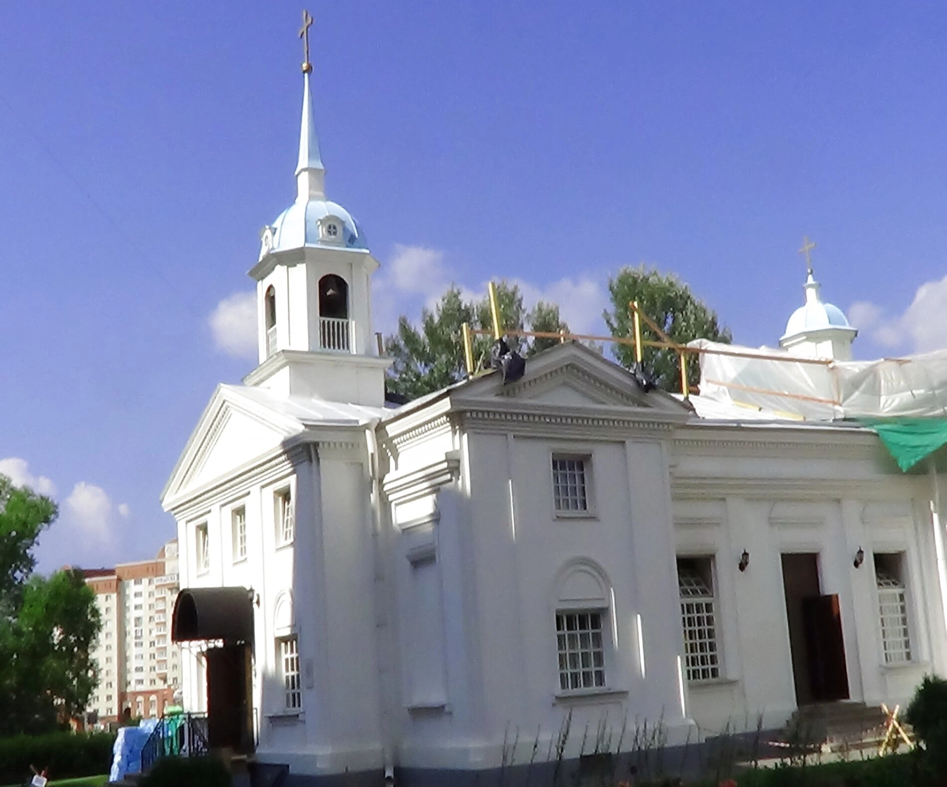 Особую ценность храма составляет его главная святыня – ковчег с частицами мощей святых мучениц Веры, Надежды, Любови и матери их Софии, к которым ежедневно приходят поклониться верующие. Церковь была построена и освящена в 2003 году на месте бывшего полкового стрельбища, став духовным центром и украшением района. На фотографии храм изображён в окружении зелени деревьев, что создаёт ощущение уюта и гармонии, а на заднем плане виднеются современные жилые кварталы, подчёркивая неразрывную связь духовной традиции и современной жизни города. Ясное небо с лёгкими облаками освещает собор мягким светом, подчеркивая его благодатную красоту и величие.