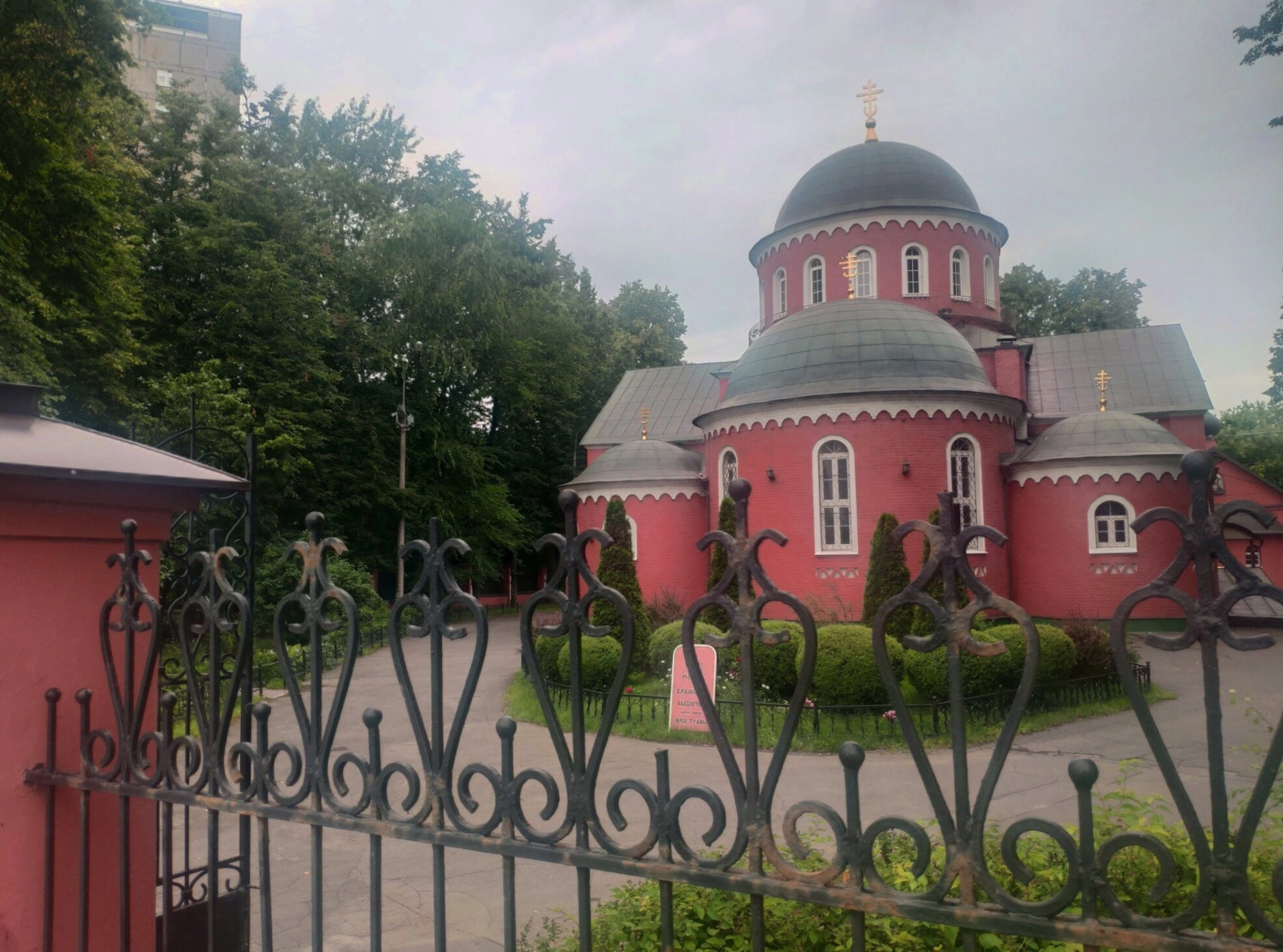 На снимке изображён фасад белоснежного храма, увенчанный златоглавыми куполами, форма которых символизирует пламя свечи. Центральный купол, символизирующий Христа, возвышается над основным объёмом, а малые главки отмечают приделы. Ярусная композиция и арочные оконные проёмы характерны для русского церковного зодчества. На переднем плане фотографии виден фрагмент изящной кованой ограды с художественными элементами, что придает всему ансамблю законченный и благолепный вид.