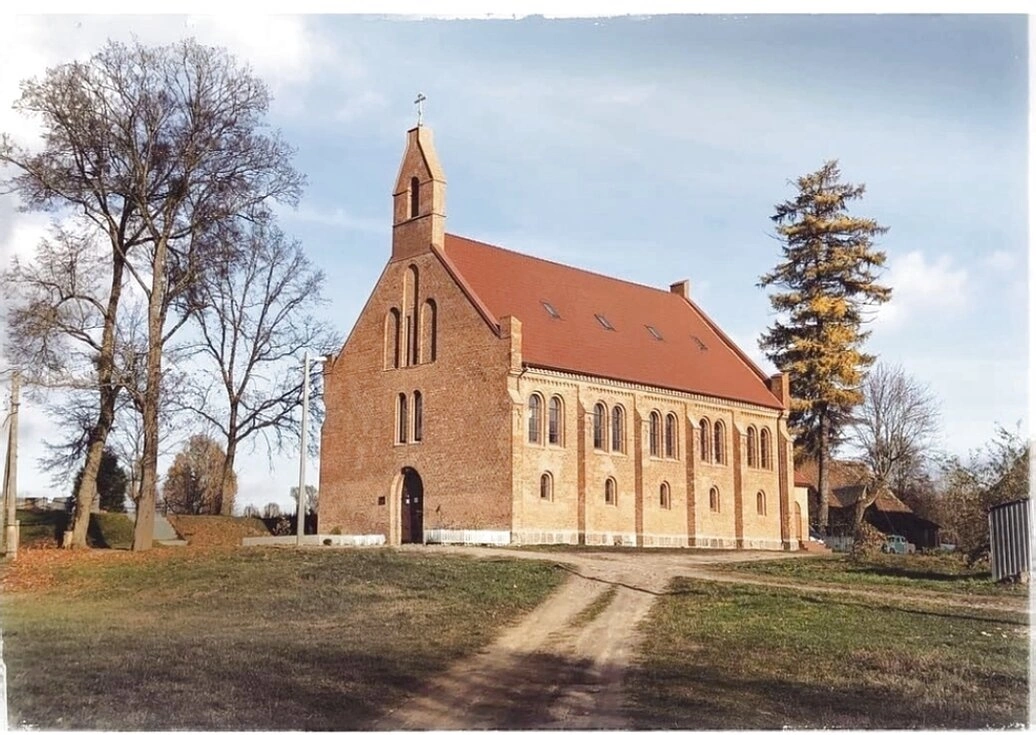 На представленной фотографии запечатлен православный храм в честь святых мучеников Адриана и Наталии, расположенный в поселке Краснолесье Нестеровского городского округа Калининградской области. Это уникальное духовное сооружение имеет богатую историю, восходящую к концу XIX века, когда на этом месте была возведена кирха Гросс Роминтена.