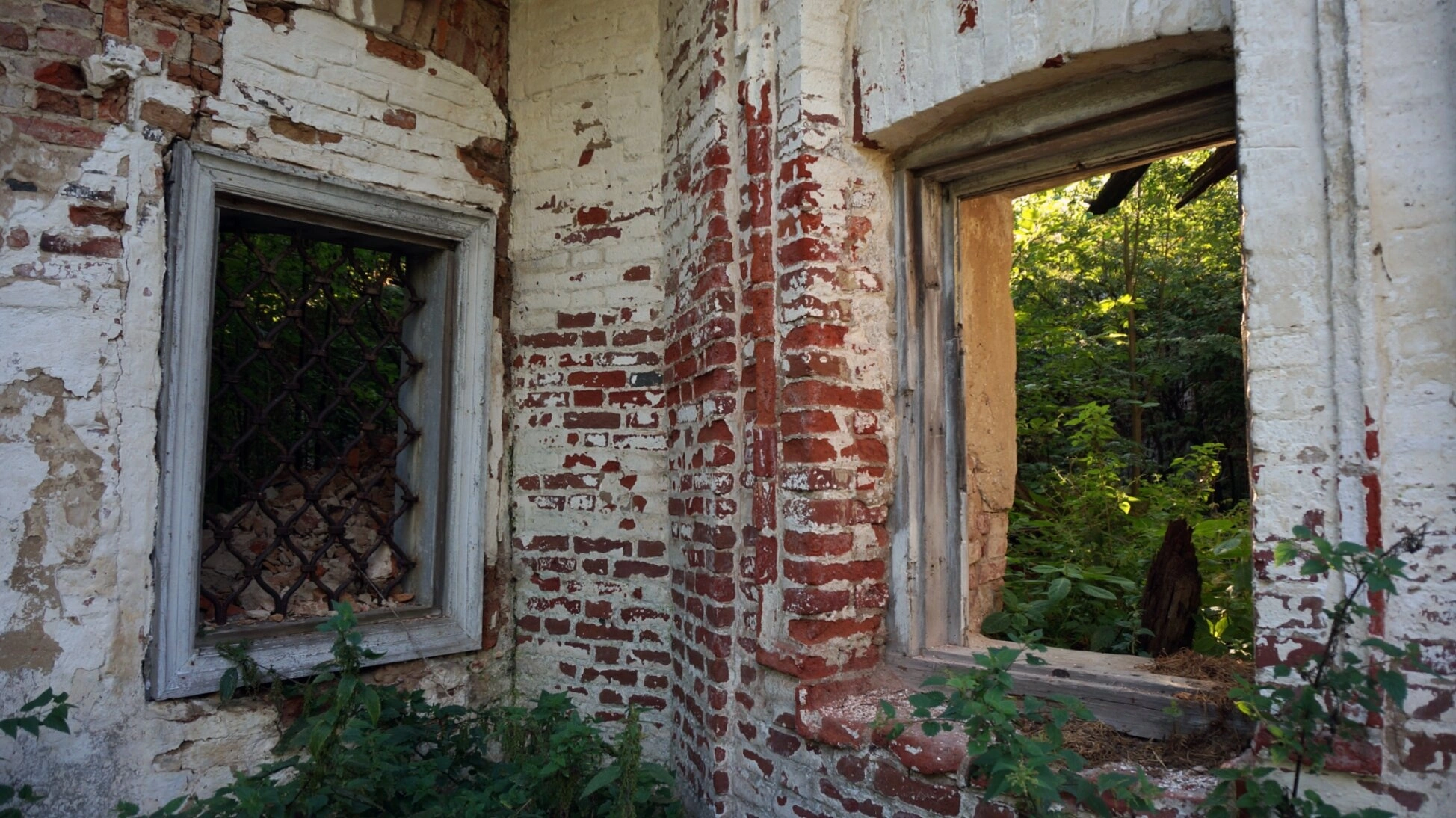 К сожалению, в годы богоборчества храм, как и многие другие святыни России, был закрыт и осквернён. Долгие десятилетия здание использовалось в хозяйственных целях, что привело к его постепенному запустению и разрушению. На фотографии видно, что святой дом пребывает в плачевном состоянии: утрачены кровля и оконные заполнения, штукатурный слой осыпался, обнажив кирпичную кладку, а внутреннее пространство храма поглотила буйная растительность.