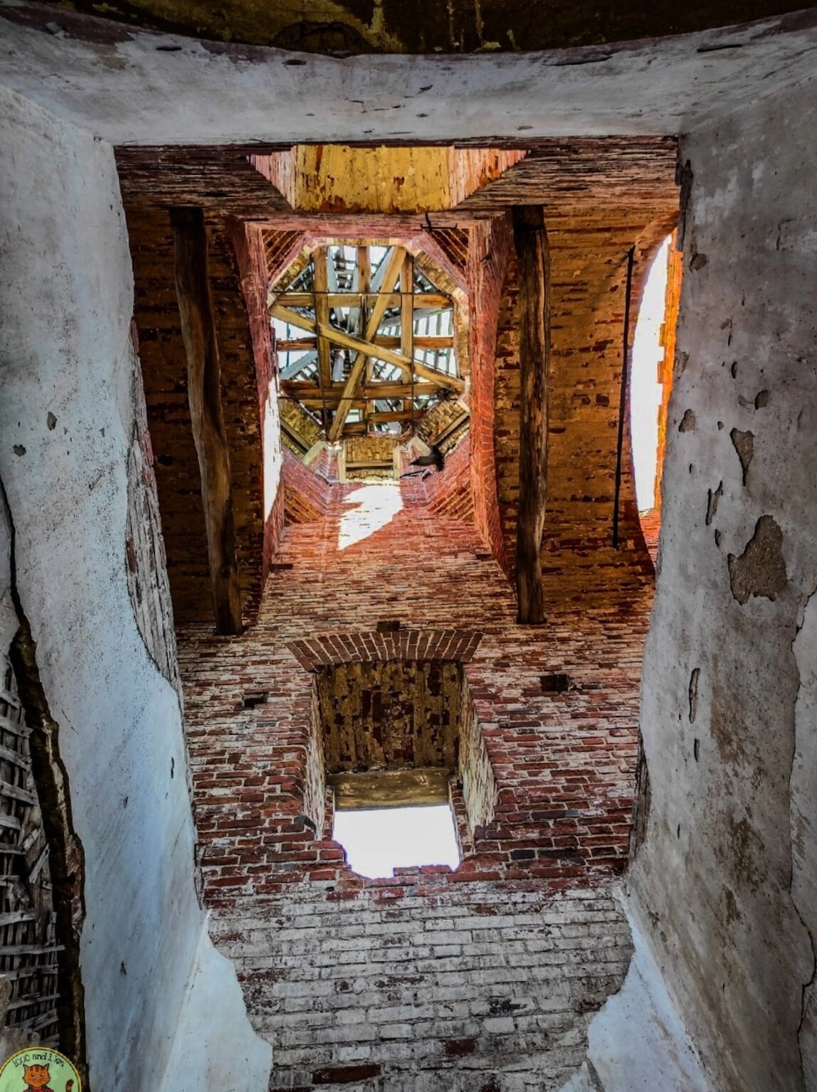 На фотографии запечатлен уникальный ракурс интерьера храма Святых Первоверховных апостолов Петра и Павла в селе Иваньково. Снимок, сделанный снизу вверх, позволяет рассмотреть величественную конструкцию церковного пространства, демонстрируя архитектурные особенности сводов и внутреннего убранства.