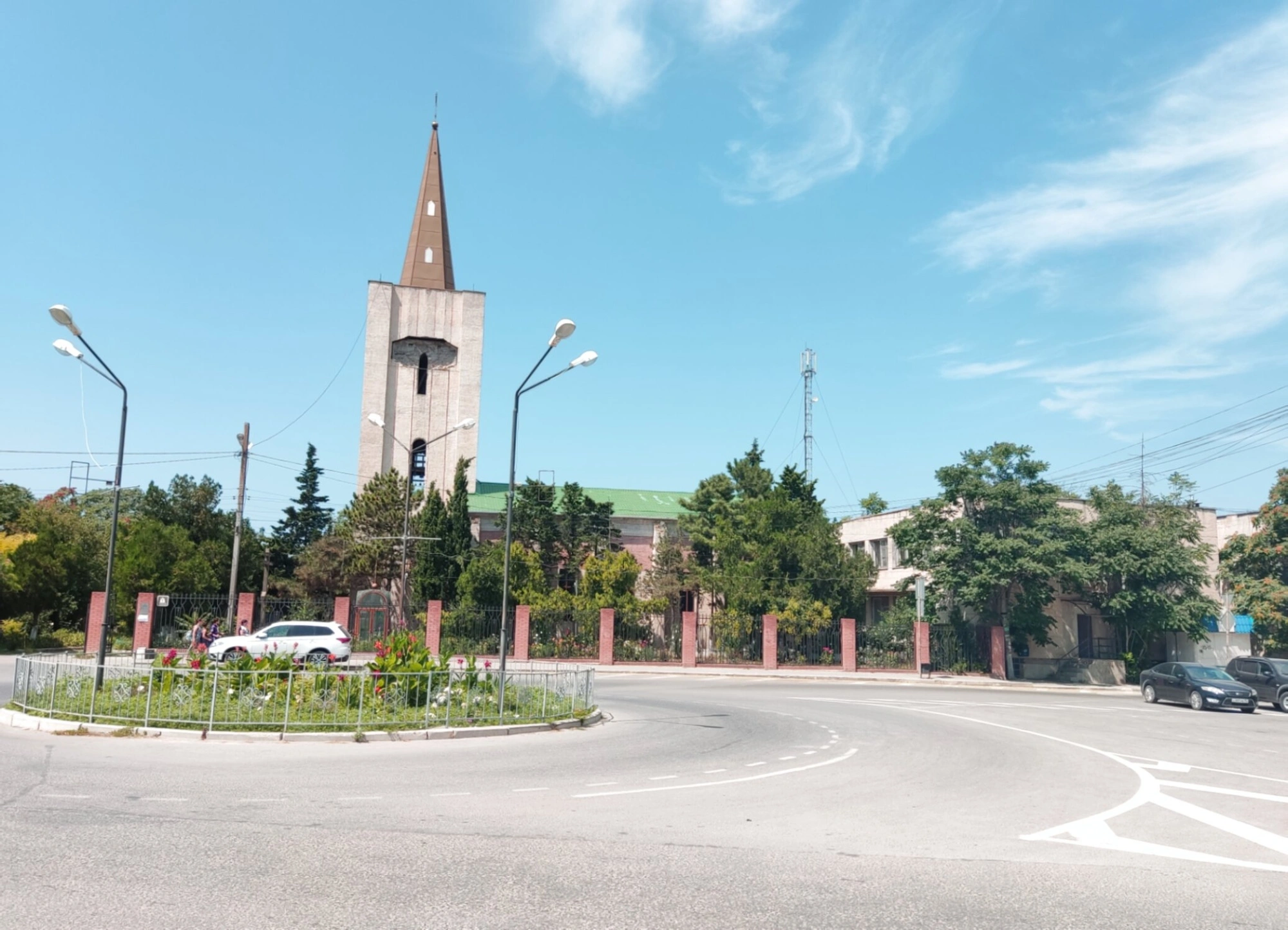 На представленной фотографии запечатлен храм в честь Святых Праведных Захарии и Елисаветы, расположенный в поселке Черноморское на западе Крымского полуострова. Святыня находится по адресу: улица Кирова, 16, и является одной из духовных доминант поселка.
