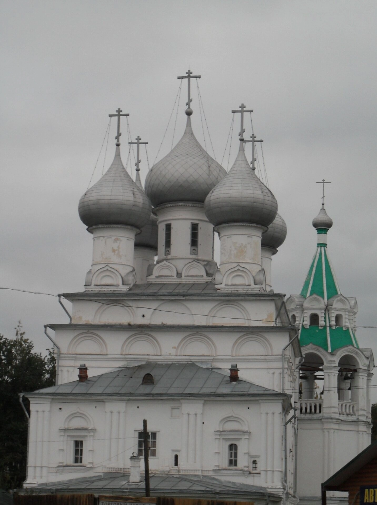 Окружение храма включает в себя элементы городского пейзажа: виднеющийся в нижней части кадра деревянный забор и вывеска, говорящая о соседстве мирской деятельности, а также верхушки деревьев, зелёные насаждения, которые часто окружают церковные дворы, создавая ощущение уединения и покоя. Данный храм является не только действующим духовным центром, но и объектом культурного наследия, привлекающим как паломников, так и ценителей православной архитектуры Русского Севера.