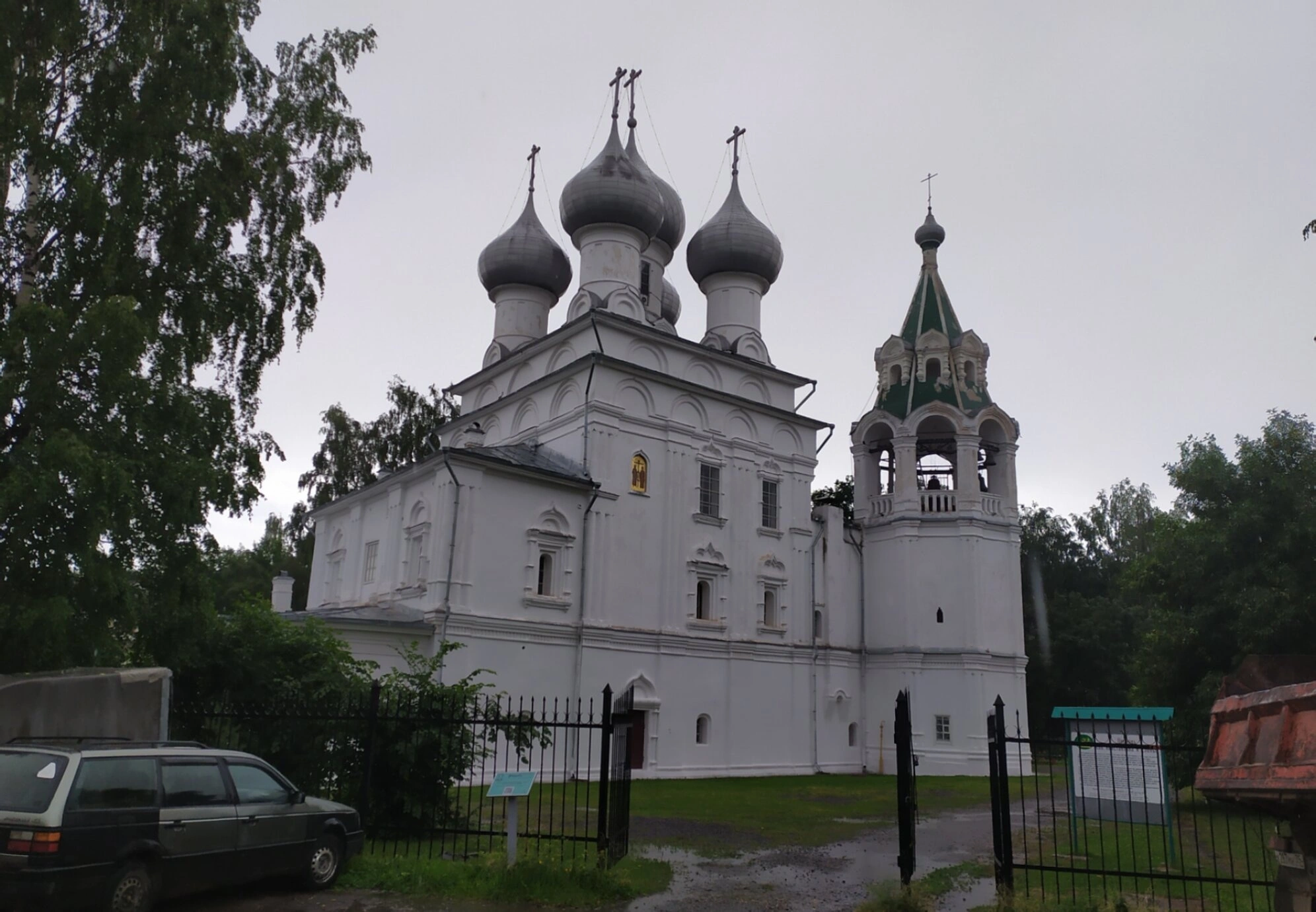 Храм утопает в зелени деревьев, что создаёт ощущение уединения и покоя. Сквозь листву виднеется ограда с калиткой, ведущей на церковную территорию. Несмотря на присутствие в кадре современного автомобиля, общий вид сохраняет атмосферу духовной строгости и благодати. Пасмурная погода, запечатлённая на снимке, мягко рассеивает свет, подчёркивая монументальность и величие святого места.